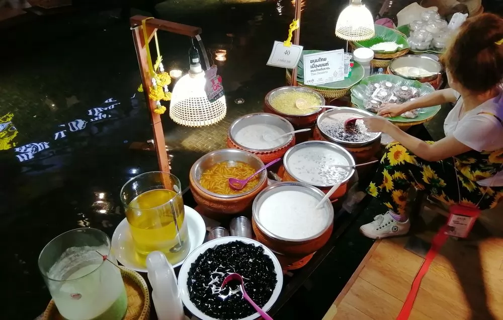 小吃攤位沿著人工河道鋪開,載滿水果、各式小吃的木船,街頭難見的泰式小吃在這裡都可以找到,好吃不貴,這樣的體驗非常有趣!