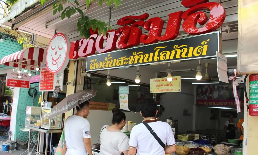 來到店前,看到招牌—圓人臉閉眼伸舌流口水,紅色店名เช็งซิมอี๊(字很大)下方有ลือลั่นสะท้านโลกันต์(意為大力宣傳),店前的櫃台上擺滿五顏六色、繽紛鮮豔的各種配料,超過50種啊!難怪會讓人忍不住流口水,尤其是在大熱天,總希望能呷涼涼的冰來消署,吃個幾大碗都可以啦!
