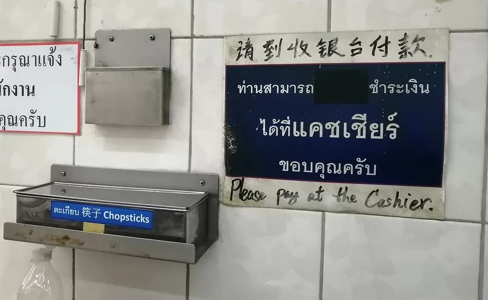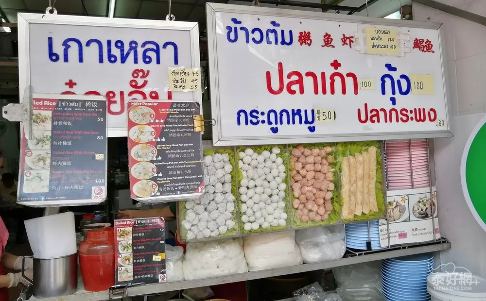 主要的菜單貼上牆上,看不懂泰文沒關係,有中文菜單,以魚丸和粥為主,其中最受歡迎的是清湯魚丸細粿條、清湯魚丸+蝦肉丸蛋麵(都是45銖)。