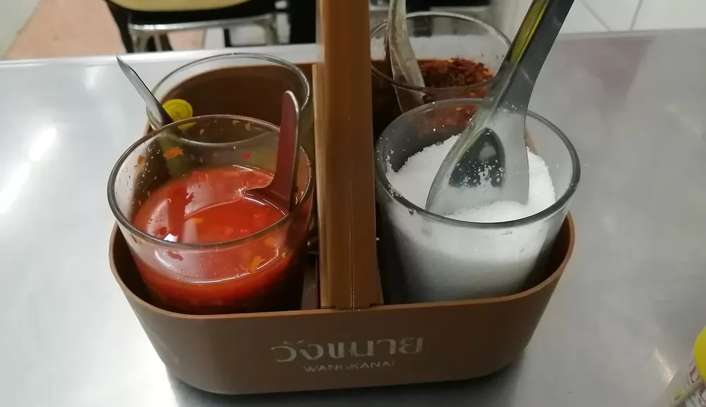 如果嫌淡,有4大調味料可加,辣椒水、魚露、辣椒粉、白糖,不管加哪種都會讓有不一樣的風味,象哥是什麼都加,吃起來夠味。