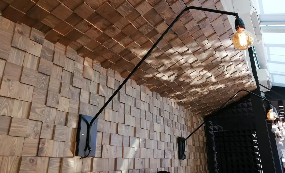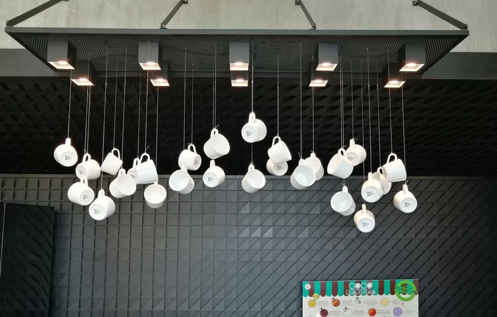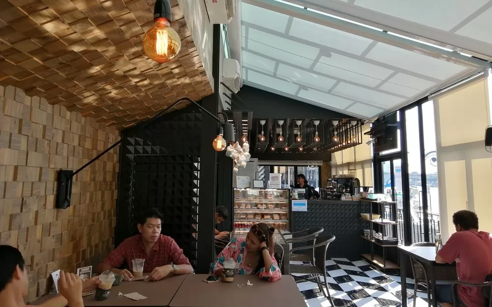 新店以鐵架支撐的半透露咖啡店,天熱則加遮陽白布,室內的裝飾也很有特色,櫃檯上的燈架、旁邊黑牆和白咖啡杯的對比、用木板塊堆砌高低不一的牆壁、黑白相間3D視覺的地板等,讓坐在裡面的客人也能有番不同的感受。