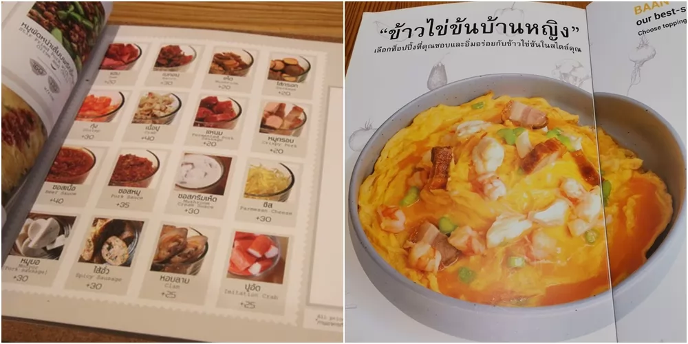 蛋+飯基本款的價格是60銖,配料部分有多達16種任選,像是火腿、香腸、香菇、蕃茄、蝦仁、蚵仔、脆皮豬肉、泰北香腸等,每加1種材料和醬汁的價格在20-40銖之間,像是蛋+飯(60銖)+ 火腿(20銖) + 培根(30銖),就是110銖,滑嫩的煎蛋搭配白飯已很好入口了,加上火腿和培根更有口感,這樣的組合很好吃,值得推薦!