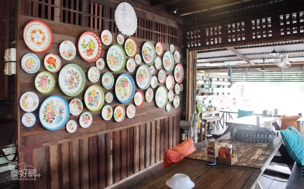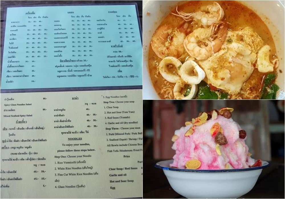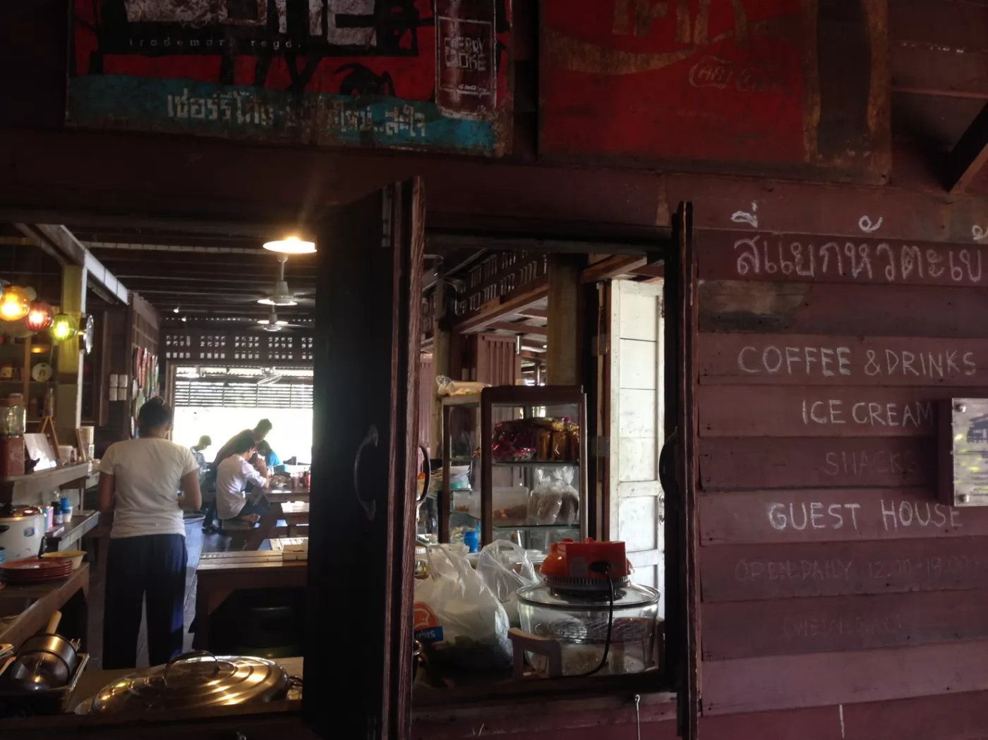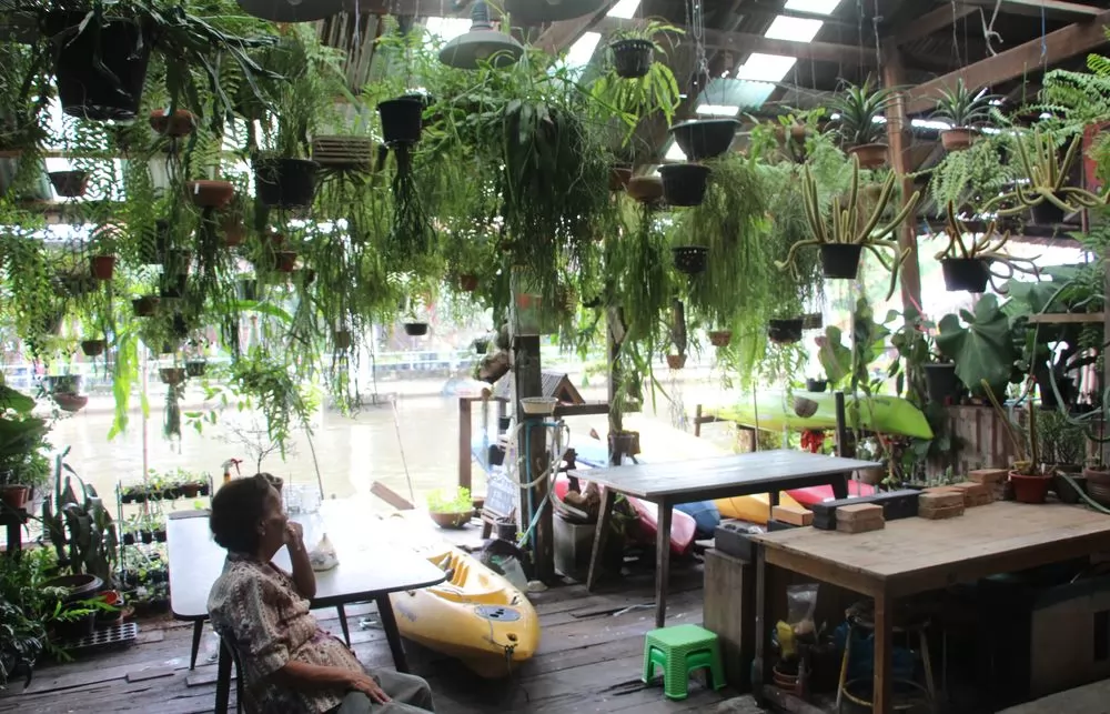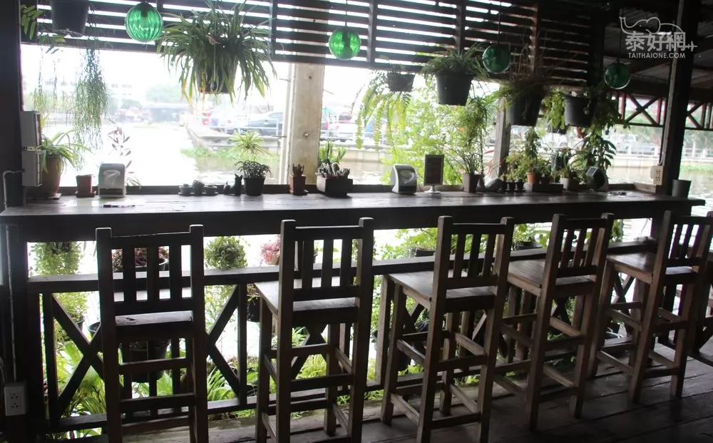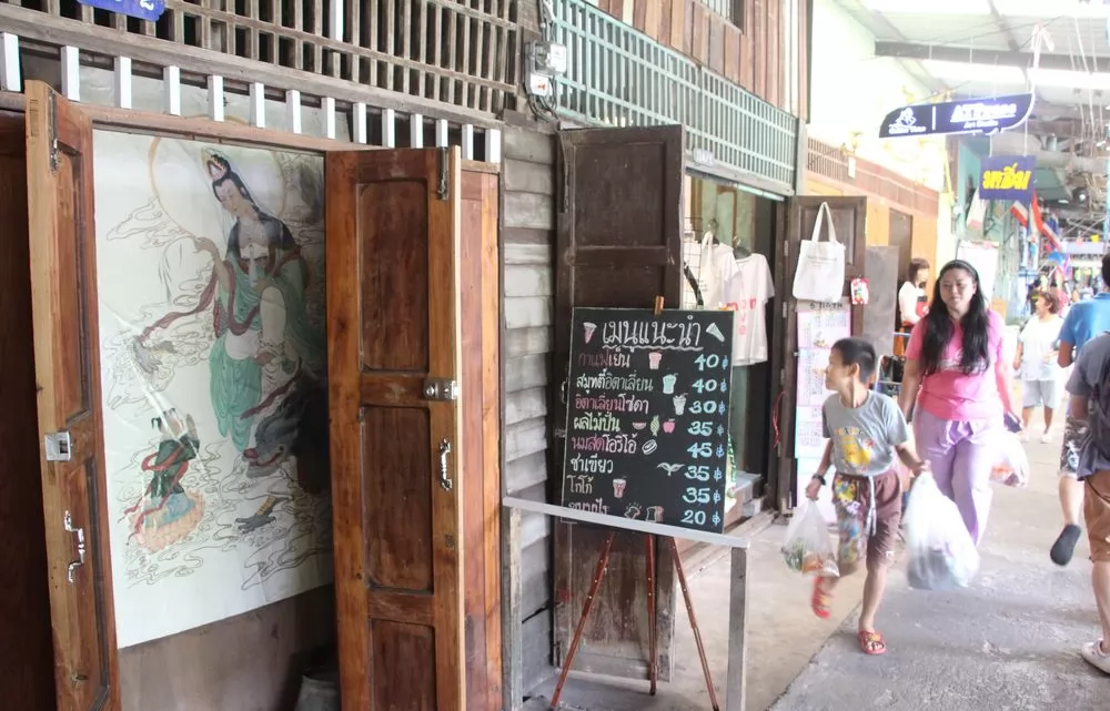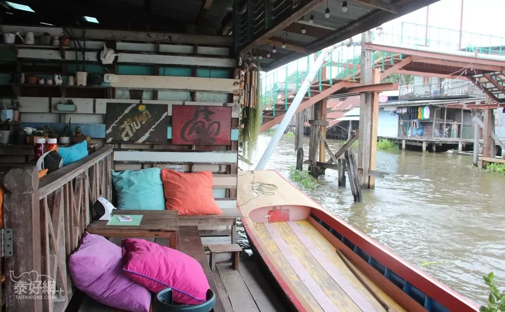 有商家也有餐廳交錯,販賣冰飲、咖啡和泰式炒粿條等,Si Yaek Huatakhe Cafe座落運河十字路口,大小鐵盤的裝飾、賞河景的高腳椅、綠意盎然的垂掛植物包圍河前座位、有皮划艇和木橋相伴的美景、慵懶嗜睡的貓米等都是賣點,加上親民美味的餐飲,泰式奶茶冰汁(ปังเย็นชาไทย)50銖;豬肉丸子雞蛋泡麵45銖。(營業時間:平日12.00-19.00周末10.00-19.00)