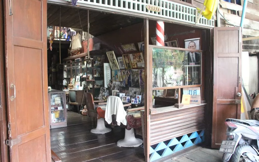 右邊則是商店、文藝品和衣服店,很多都保有當時的原貌,聯想到百年前華僑來到這裡生活情況,每間店都是拍照熱點,像這家理髮店,有如文物館,還有營業。