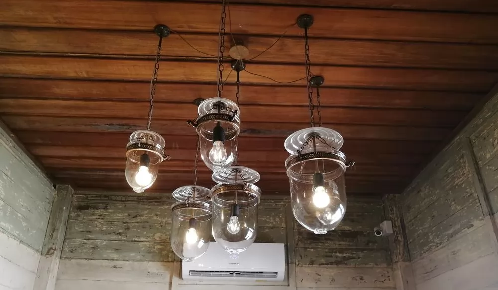 想到樓上得走室外的樓梯,房子的屋頂被挑高,因此2F內里非常通透、清新,兩樓層都保留幾代人積累的舊物,像是生鏽的熨斗、瓷碗、復古梳妝檯等,值得關注的是老式開關和復古吊燈,各式的電燈呈現不同的風貌。