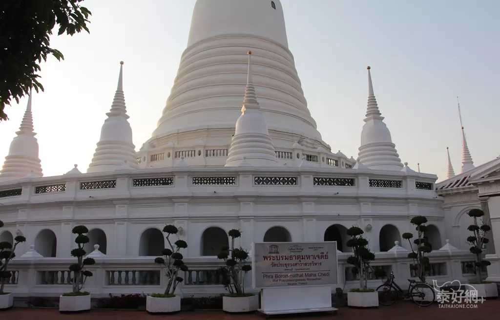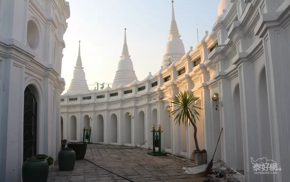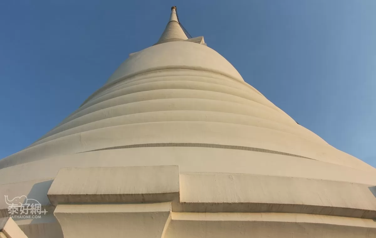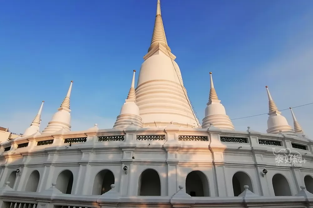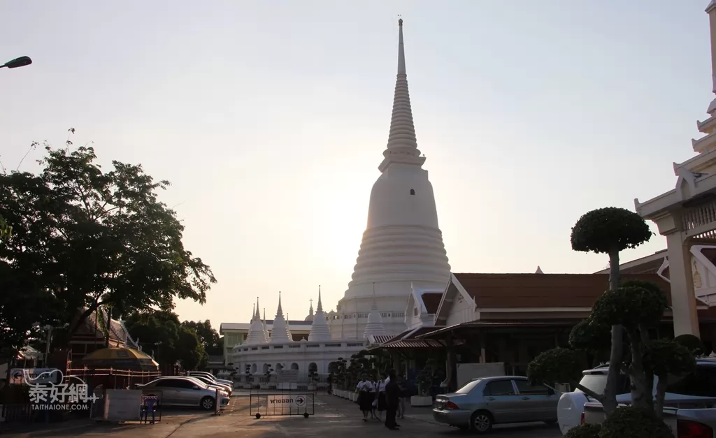 這座寺廟承載著悠久的歷史,始建於兩百年前,拉瑪三世時期建造,這座寺廟獨有的特色有一座白色的大佛塔(Phra Borommathat Maha Chedi;พระบรมธาตุมหาเจดีย์),周圍環繞18個小佛塔。入夜後打上燈光,更具氣勢。