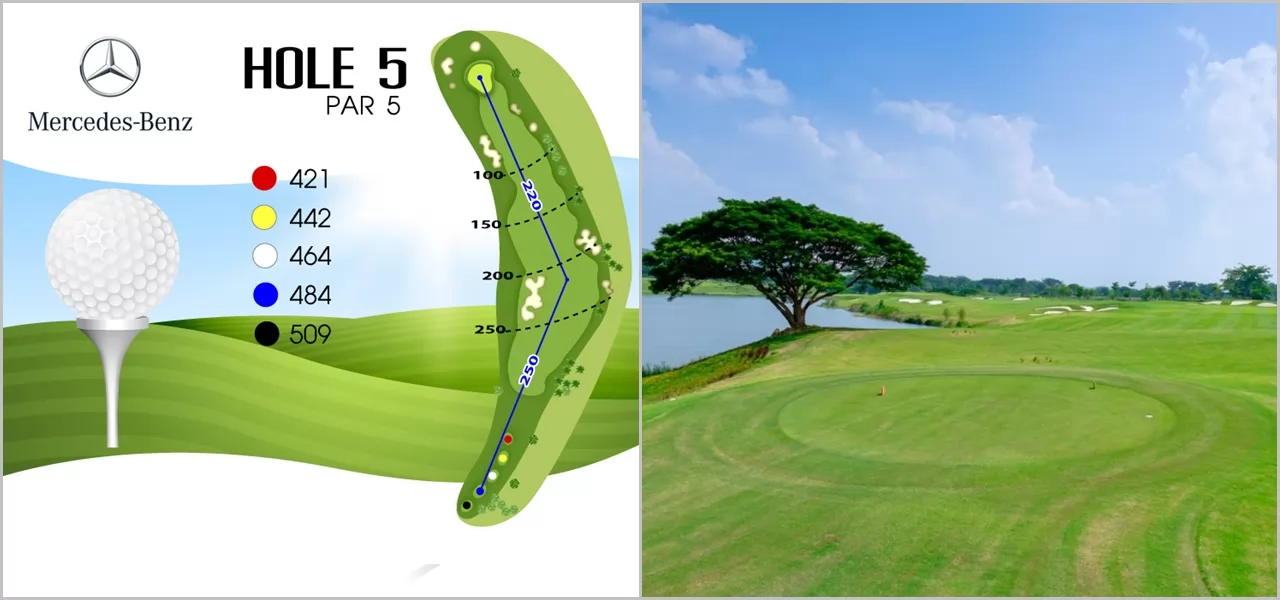 第5洞是這座球場的標誌,557碼、標準5桿的長洞,球場最長的一洞,跟隨地勢來設計障礙,球道有對稱的長沙坑,地勢不斷上升的果嶺,周圍有沙坑、草坑護衛、再過去是3面環水的致命障礙,能以3桿上果嶺就算是完美了!
