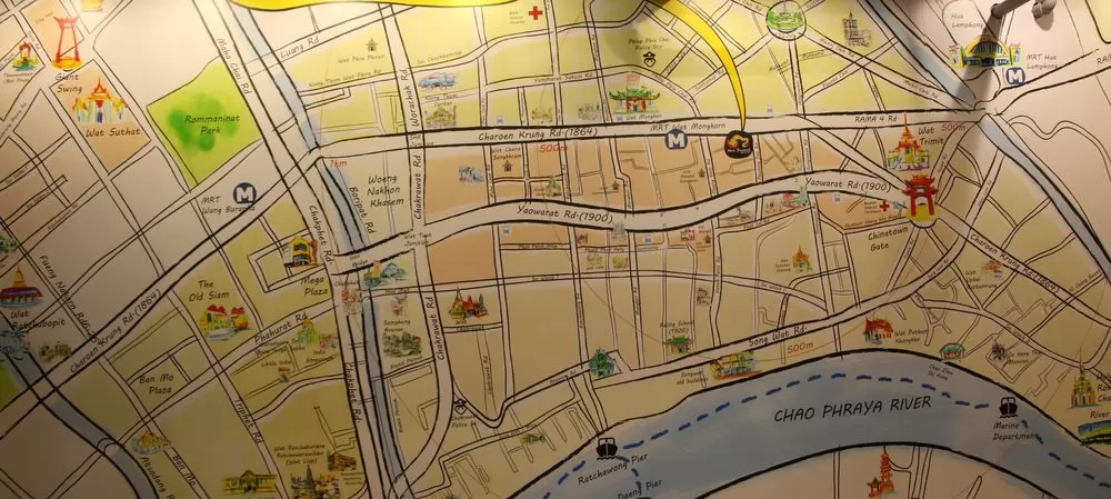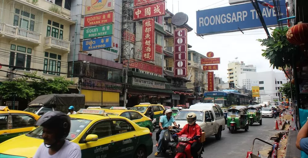 所謂的中國城,指的是耀華力(Yaowarat Rd)與石龍軍(Charoen Krung Rd)兩條路與周邊一帶,前者由東往西單行、後者由西往東單行,平行之間有無數的巷道連結,其中耀華力路又稱之為「唐人街」。