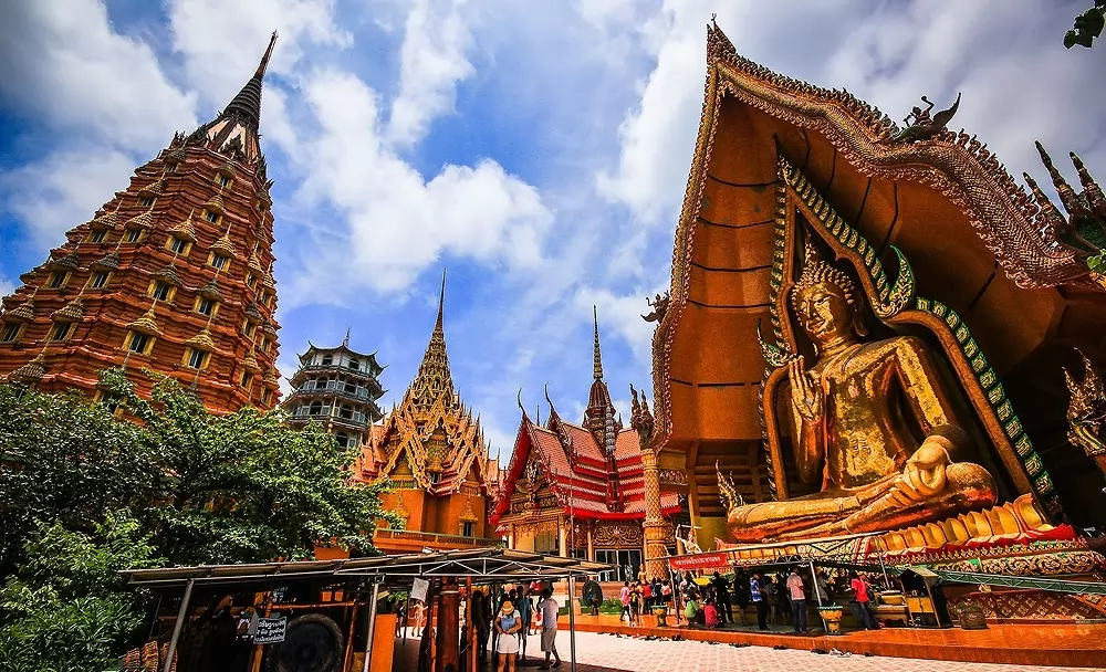 供奉1尊高達18米的金色大佛,獨特的尖頂造型。還有泰國傳統的寺廟和印度式的佛塔,與後方中式龍山寺的寶塔相互輝映,遠遠就能看到,非常壯觀。