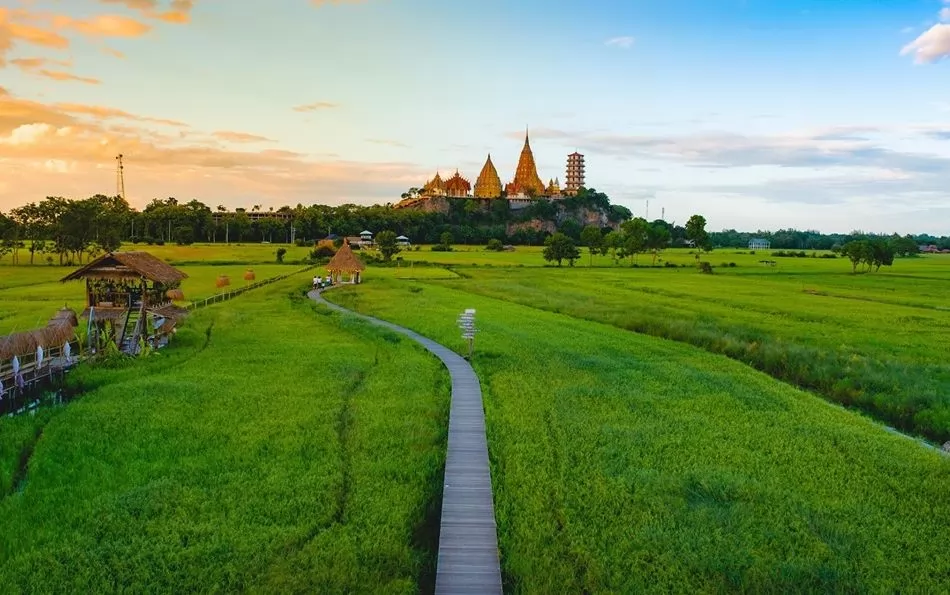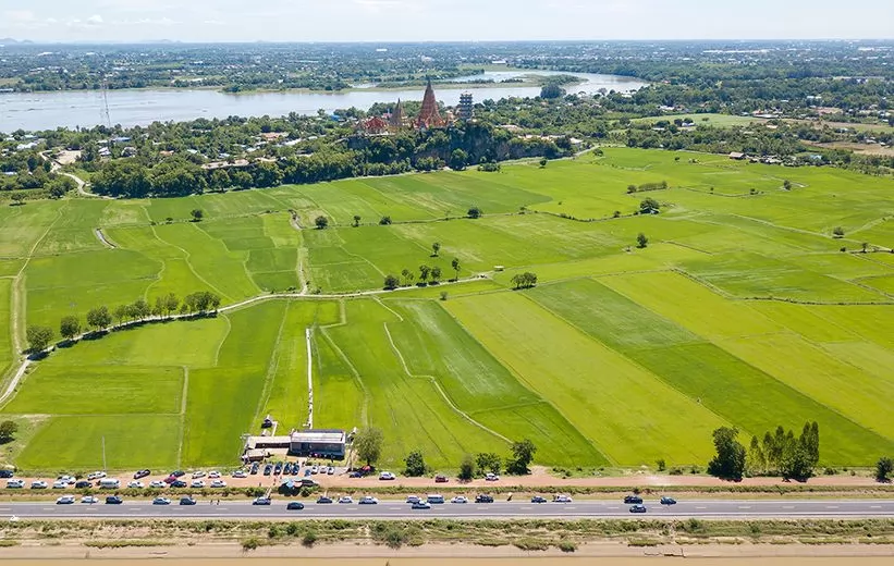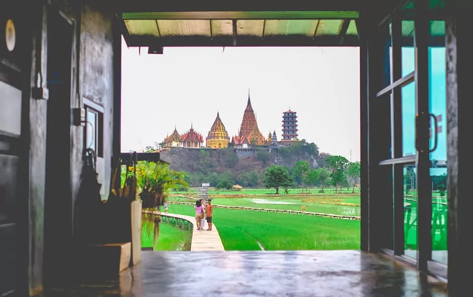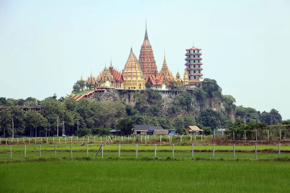 一大片綠油油的稻田,可以遠眺到北碧(Kanchanaburi)最出名、香火最鼎盛的Wat Tham Sua(วัดถ้ำเสือ)虎穴廟,建在桂河畔的1座山頂上。