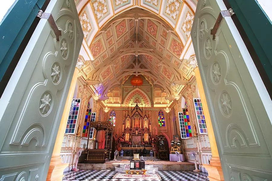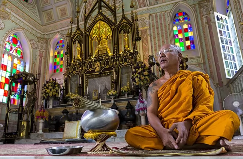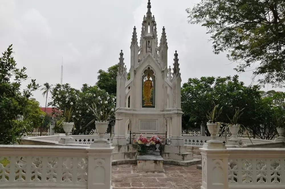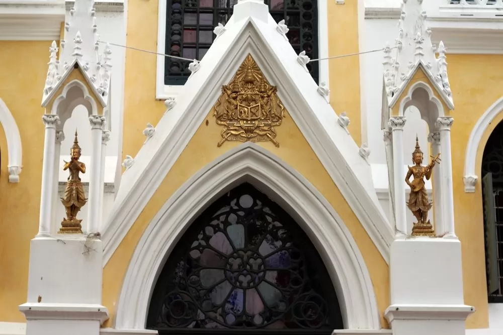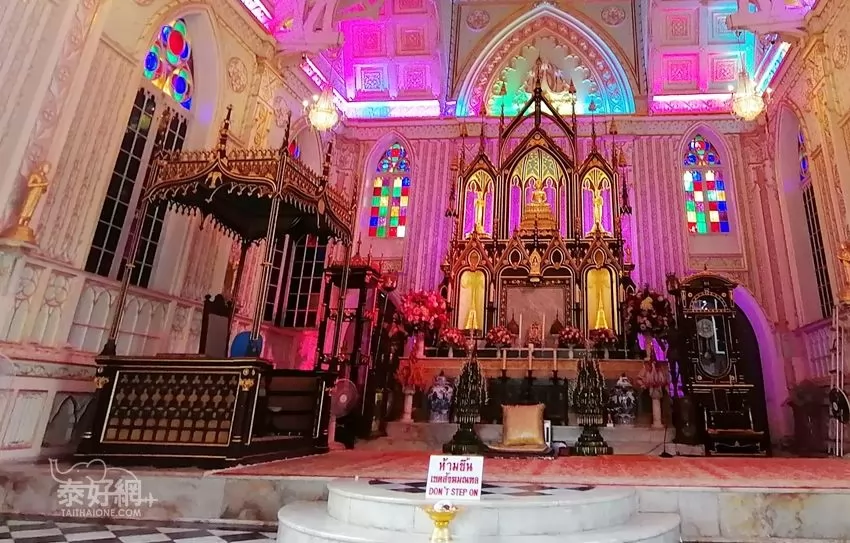 主殿堂的上方,沒有聖母瑪利亞和耶穌神像,反而供奉釋迦牟尼佛(Phra Buddha Naruemol Thammophas),基座的設計和裝飾類似於基督教教堂中放置十字架的基座。左右兩側都有使徒。陽光下,金燦燦的大城時期佛像,更顯得神聖莊嚴。