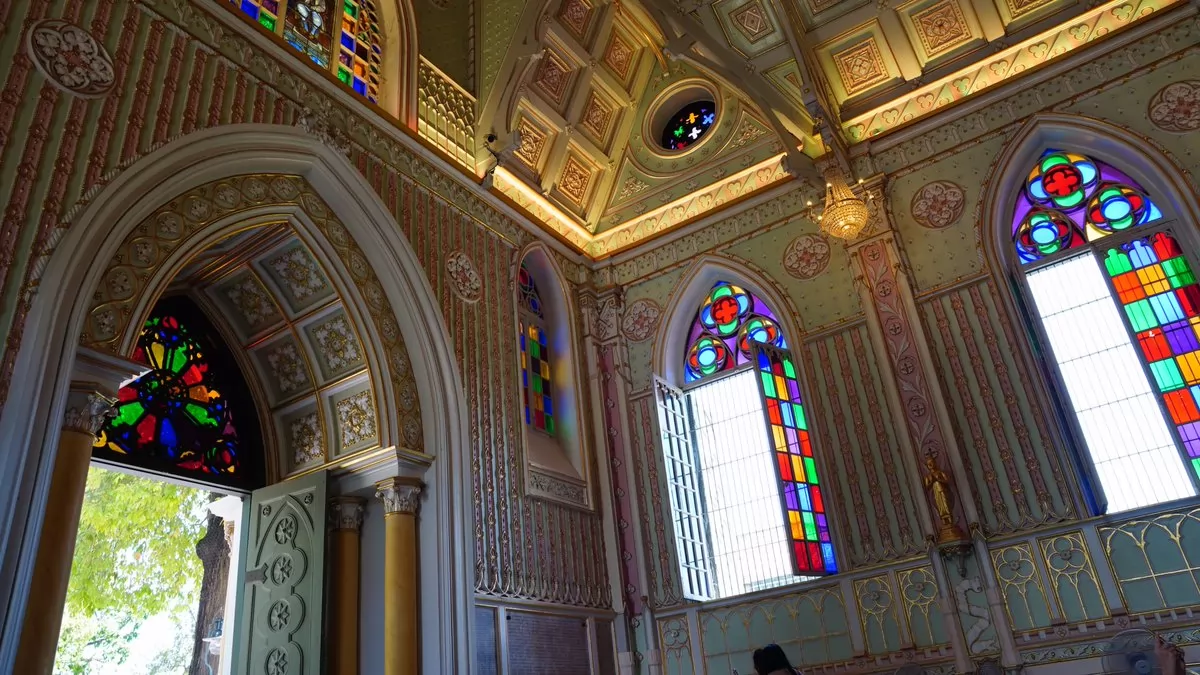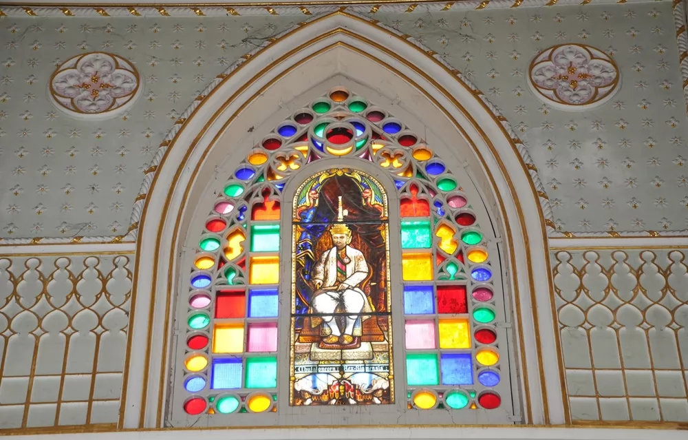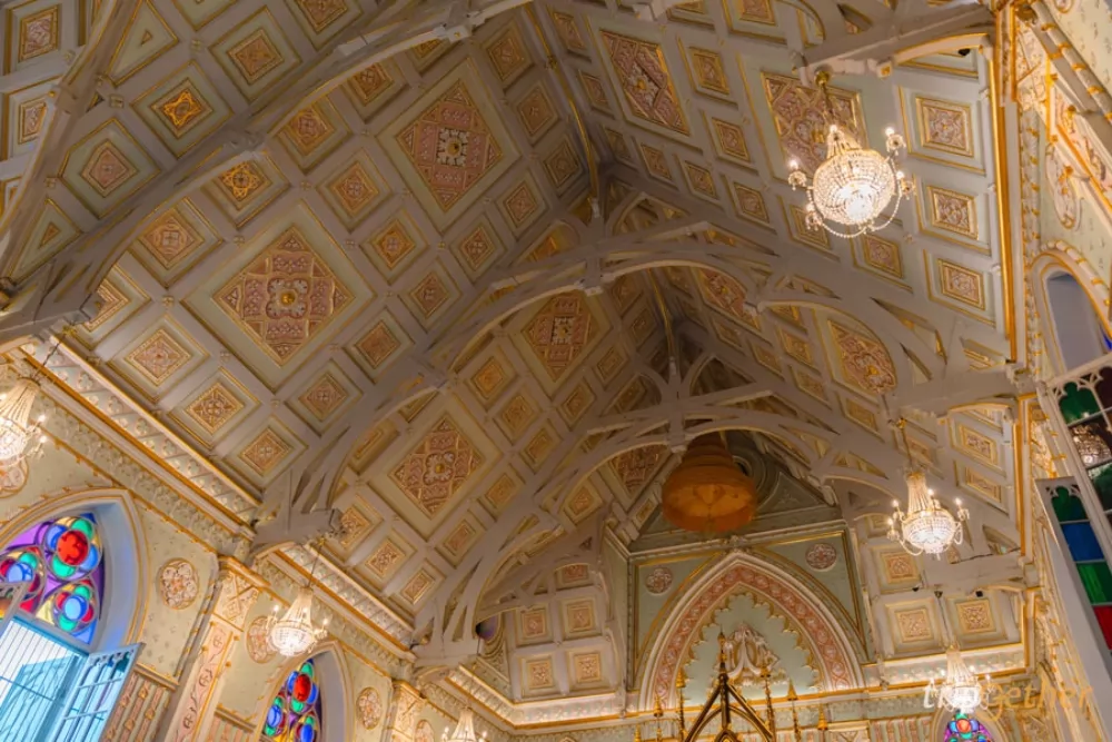 至於佛堂天花板的上部,則有結合歐洲元素的佛教藝術圖案。無論是天花板星星還是花卉圖案設計和門上,還裝飾有彩色玻璃或馬賽克玻璃。