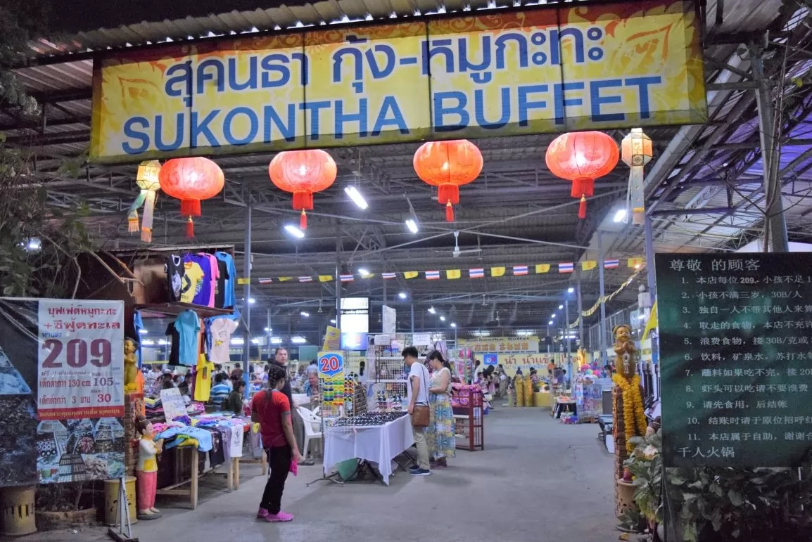 清邁Sukontha Buffet,可容納1千人就餐,深受遊客的喜愛,又名「千人火鍋」。要容納千人吃飯,需要擺上百張桌子,所以整個場地是個露天的大棚子,非常大,十分接地氣。在這裡能體驗到前所未有的壯觀場面,還有吃不完的美食。