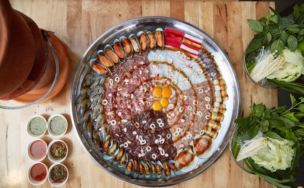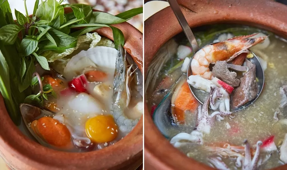 用炭火燒的土製火鍋,新奇又獨特,更符合泰式火鍋原始的特徵—酸、辣,吃起來也別有風情!加入紫蘇、羅勒、薄荷的湯底散發著迷人的香氣,放入牛肉片、蔬菜、海鮮。生雞蛋拌著肉片口感爽滑,熱熱的湯汁,裹著草藥的香味,再搭配以濃郁的泰式沾料,簡直是味蕾的一大享受!