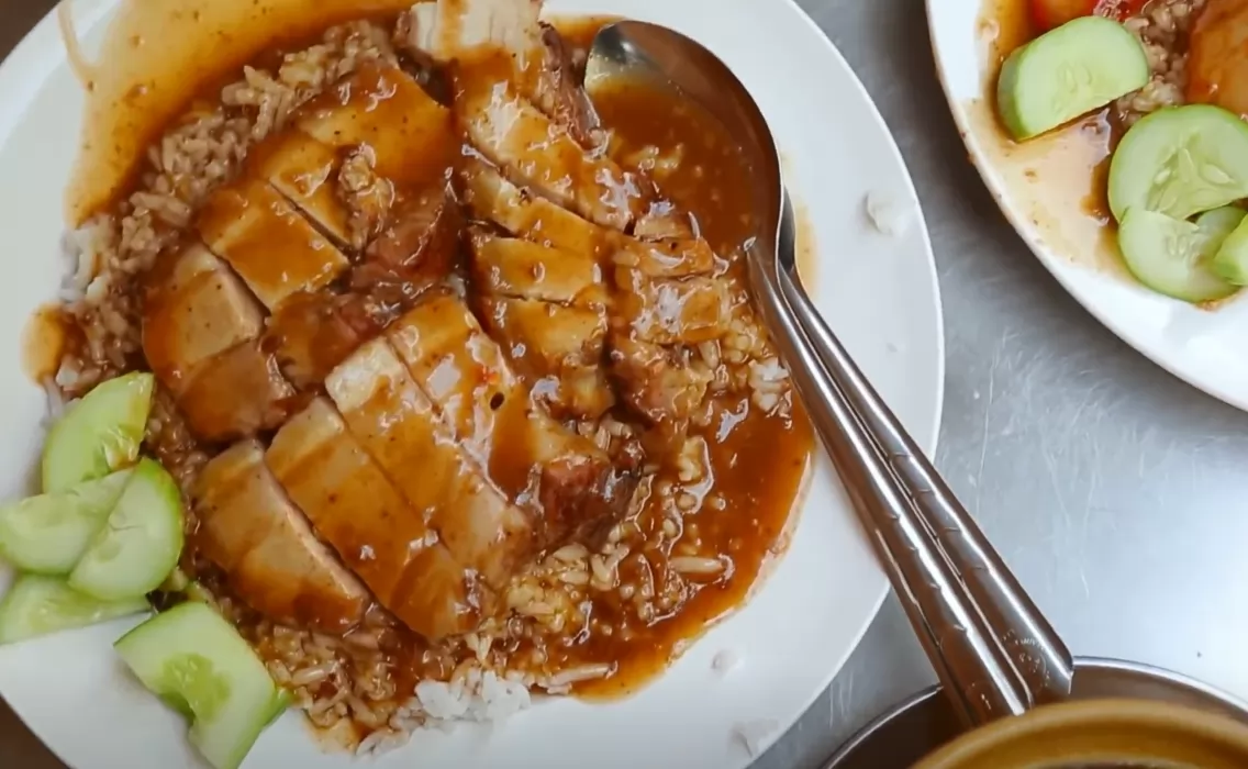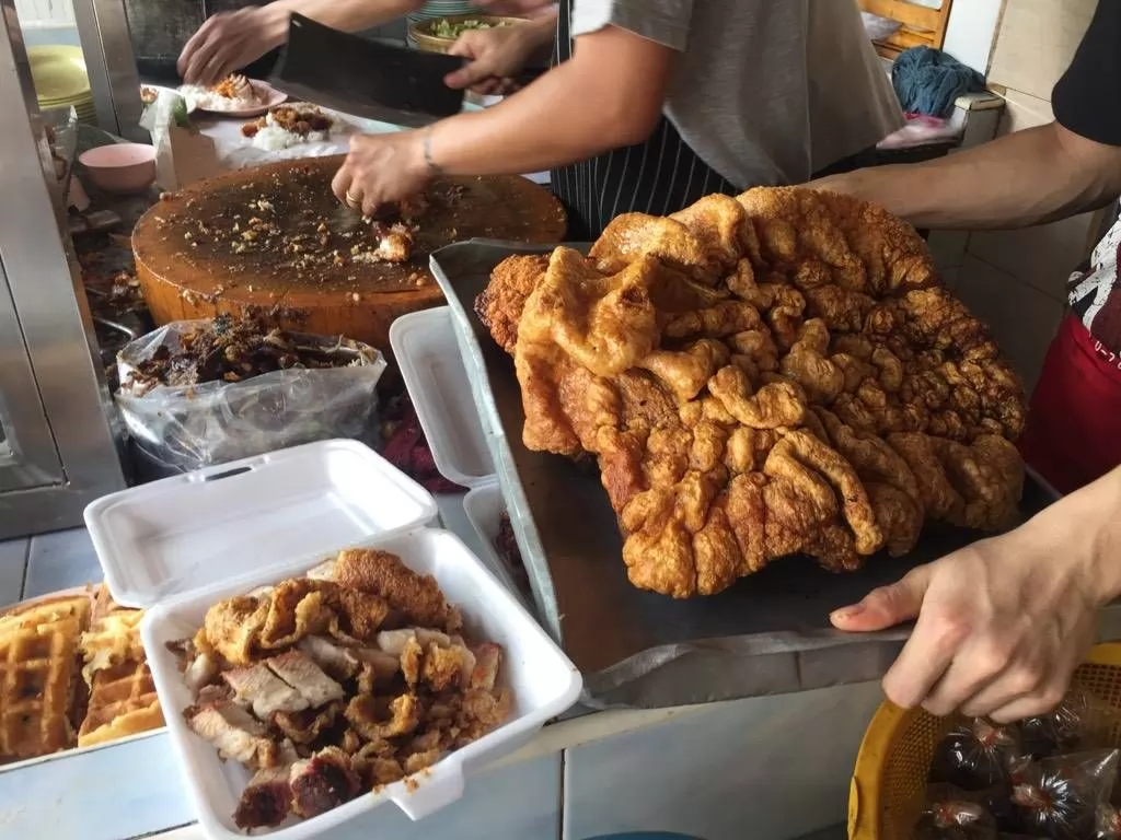 Trolrongmoo巷一家古老的脆皮肉店,豬肉緊致,咬一口就能體會到香脆和柔軟混合在嘴裡的感覺,推薦點檸檬鴨湯(เป็ดตุ๋นมะนาว)一起吃,絕對美味!