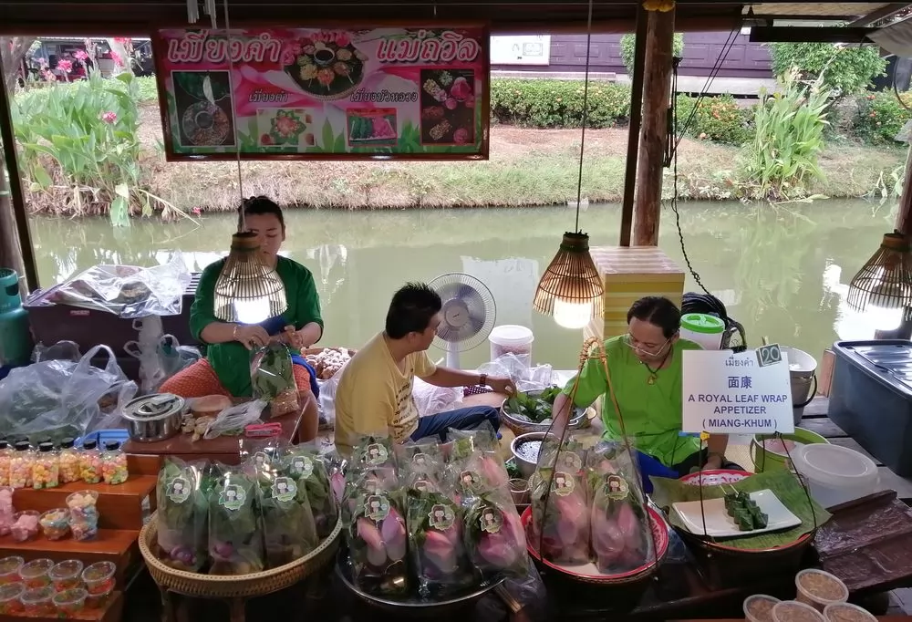 市場有250個商店之多,佈置很多區,有紀念品區、食品區、餐飲區、休息—水療區。慢慢向前走,會有路標告訴告各個區和重要的景點怎麼走,像表演場地、水上市場的藝術文化表演等,都是遊客很感興趣的地方。