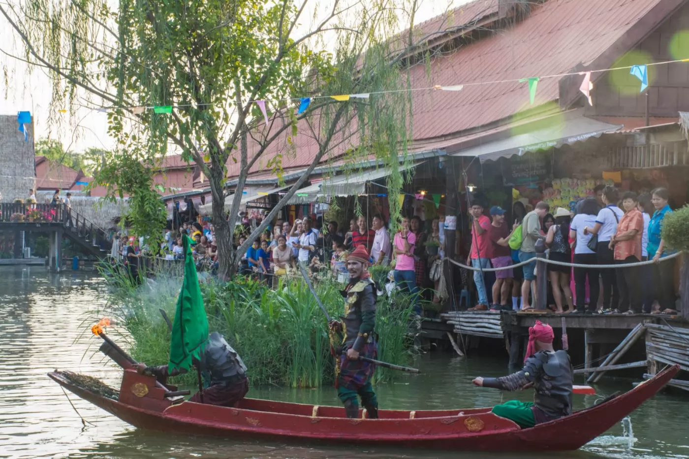 大城水上市場位於市區,面積60萊,是一個仿古的市場,有河流與自然風光環繞,環境優美,泰式風格裝飾,掛在彩色小旗幟把整個視覺顯得豐富。