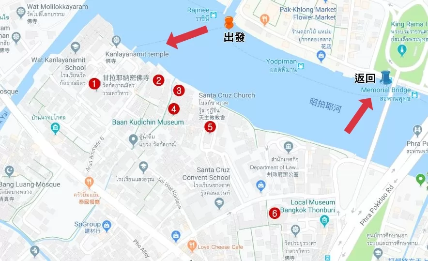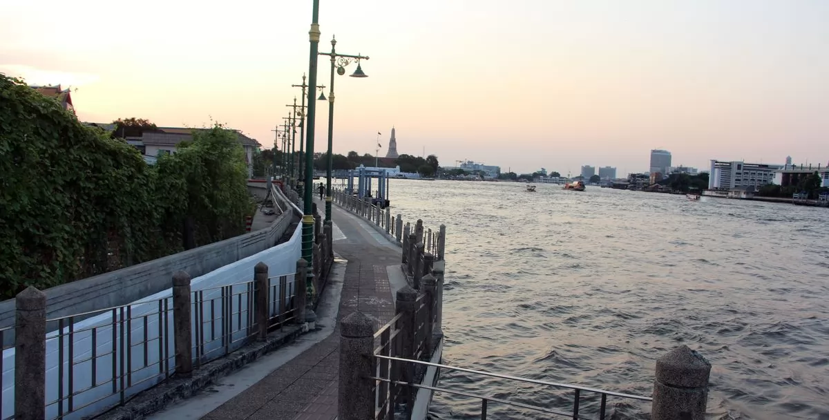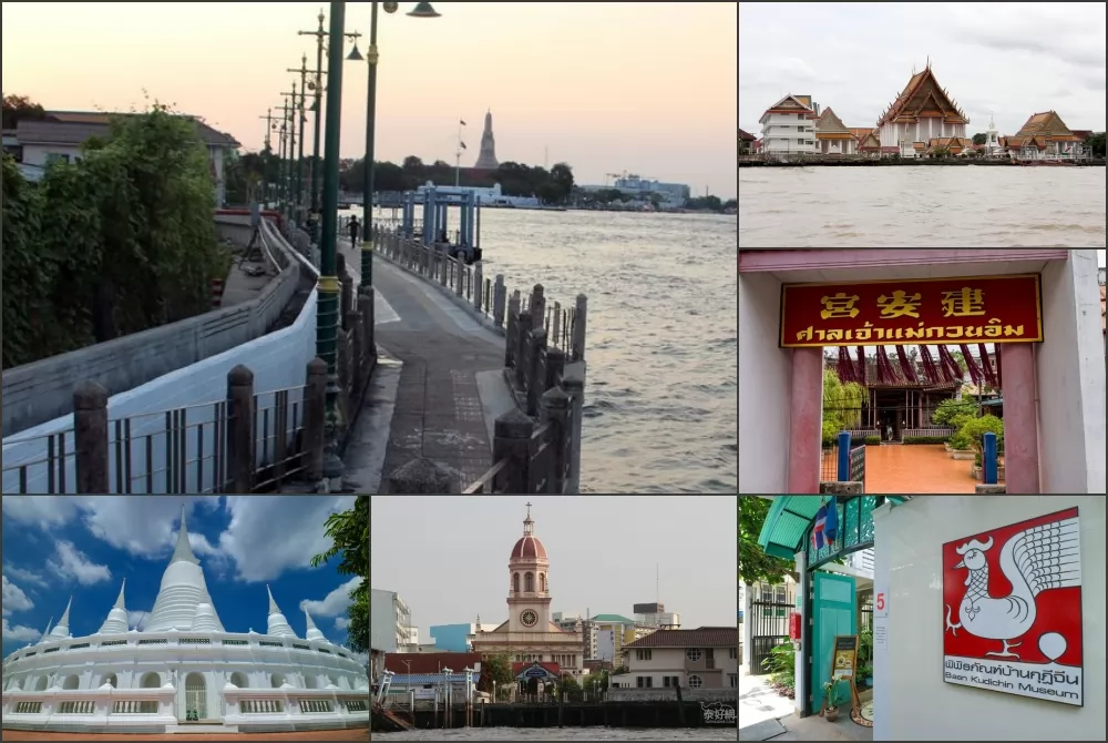 湄南河西岸的吞武里區,紀念鐵橋(Saphan Phut)下,有條河岸步行和騎行道,連結中國教堂(Kudi Jeen;กุฎีจีน)老社區,可去參拜多座老寺院、教堂和吃到傳統美食,日落時分返回,更是沐浴在金黃超靚的景色中。