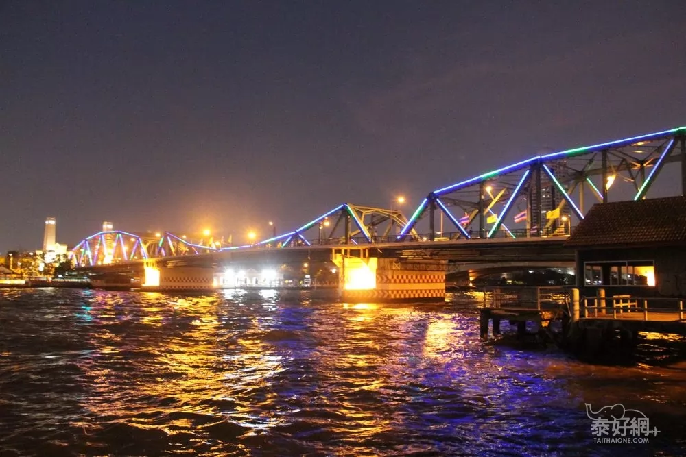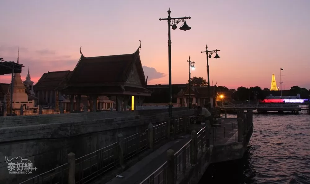 參觀完帕榮寺近6點,走回三寶寺搭船到Yod Piman碼頭,卻發現5點後無船,不過,卻意外看到落日的湄南河西岸景色和夜景,沿河岸步道一路欣賞,再過了紀念鐵橋,轉到Yod Piman碼頭。