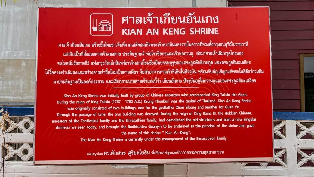 建安宮(Kian Un Keng Shrine;ศาลเจ้าเกียนอันเกง),曼谷最古老的中國道教寺廟,由福建華僑在吞武里王朝建造,手工精細的木建築,有一座清朝道光28年戊申年(1848年)建造的銅鐘。