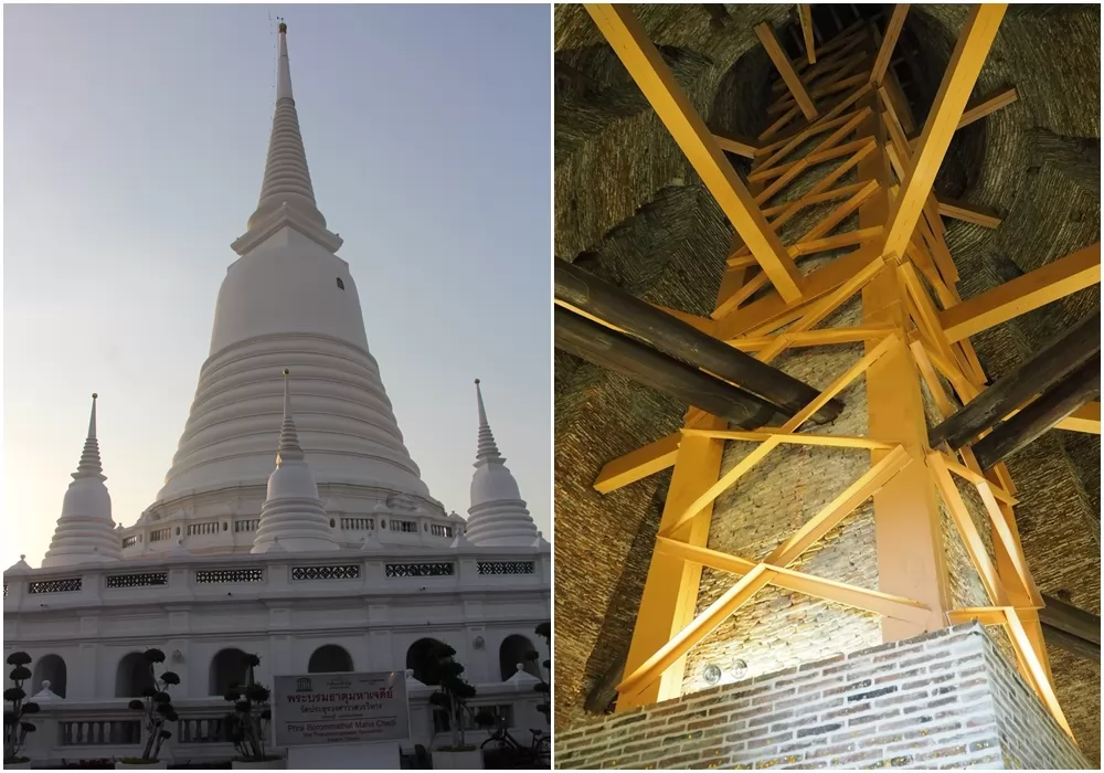 來到佛塔第2層,有圓環式的迴廊,也能通往塔頂的內部,裡面有個小神壇,抬頭可見佛塔中央用巨木和鐵柱支撐的結構組合。拜訪這座寺廟讓人深切感受到泰國人民對「傳統遺產」的熱愛和合作的力量。