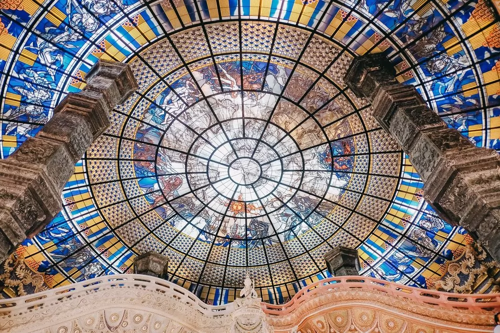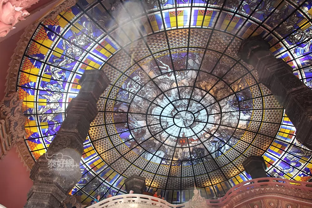 拾梯而上,整個天堂的佈置,沿襲四海一家的概念,屋頂透光的彩色玻璃是德國藝術家所繪制的五大洲及十二星座的地圖,陽光穿過屋頂照射進來的美麗景象。