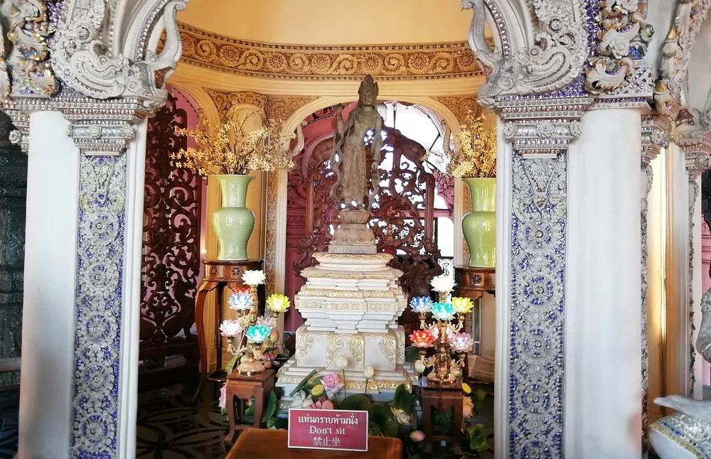 泰式中央角亭,裡面供奉的卻是古老柚木雕塑的觀音菩薩像。