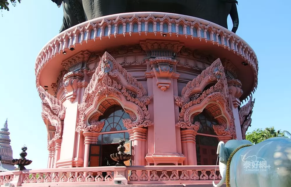 主建築分為兩部,上半部是張力十足的三頭象身,中間象頭還有閃亮亮的銅片,由手工藝師們以純銅打造,重量約為250噸、高29米;下半部是支撐象身的歐、泰式混搭的粉紅色基座,兩部總高度43.60米,是全亞洲最大的三頭象神廟。