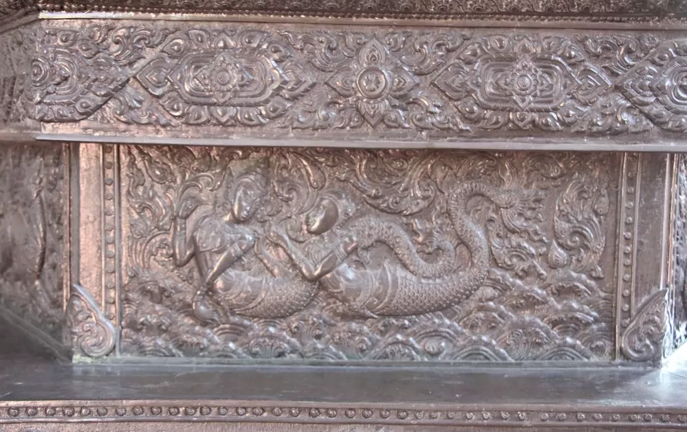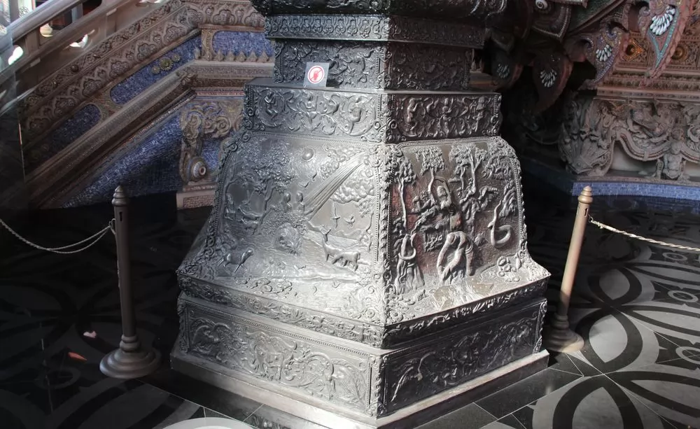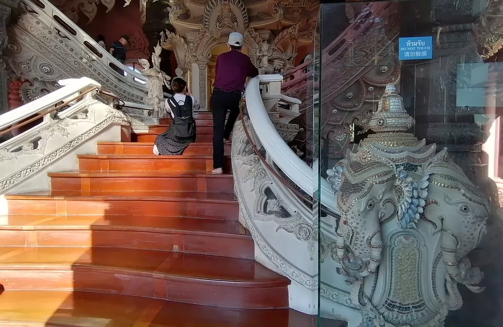 支撐象身的粉紅色基座,以傳說中的守護魚神圍繞大廳,第一層階梯兩端是以景泰藍瓷片拚貼的三頭象;第二層階梯左右兩端分別是金那利人鳥神,扶手也是由黃銅打造的象頭來支撐。大廳的四根柱子,由製錫大師親手錘煉出「伊斯蘭教、印度教、佛教、基督教」等世界四大宗教故事,象徵宗教撐起這個世界。