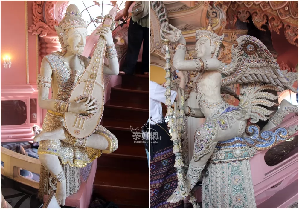 整座廳堂內部按照泰國中部佛丕府(Phrtburi)的傳統建築裝飾工藝,拚貼而成,工法細膩令人稱奇。各種守護神神像,動作、姿勢都雕琢的栩栩如生。
