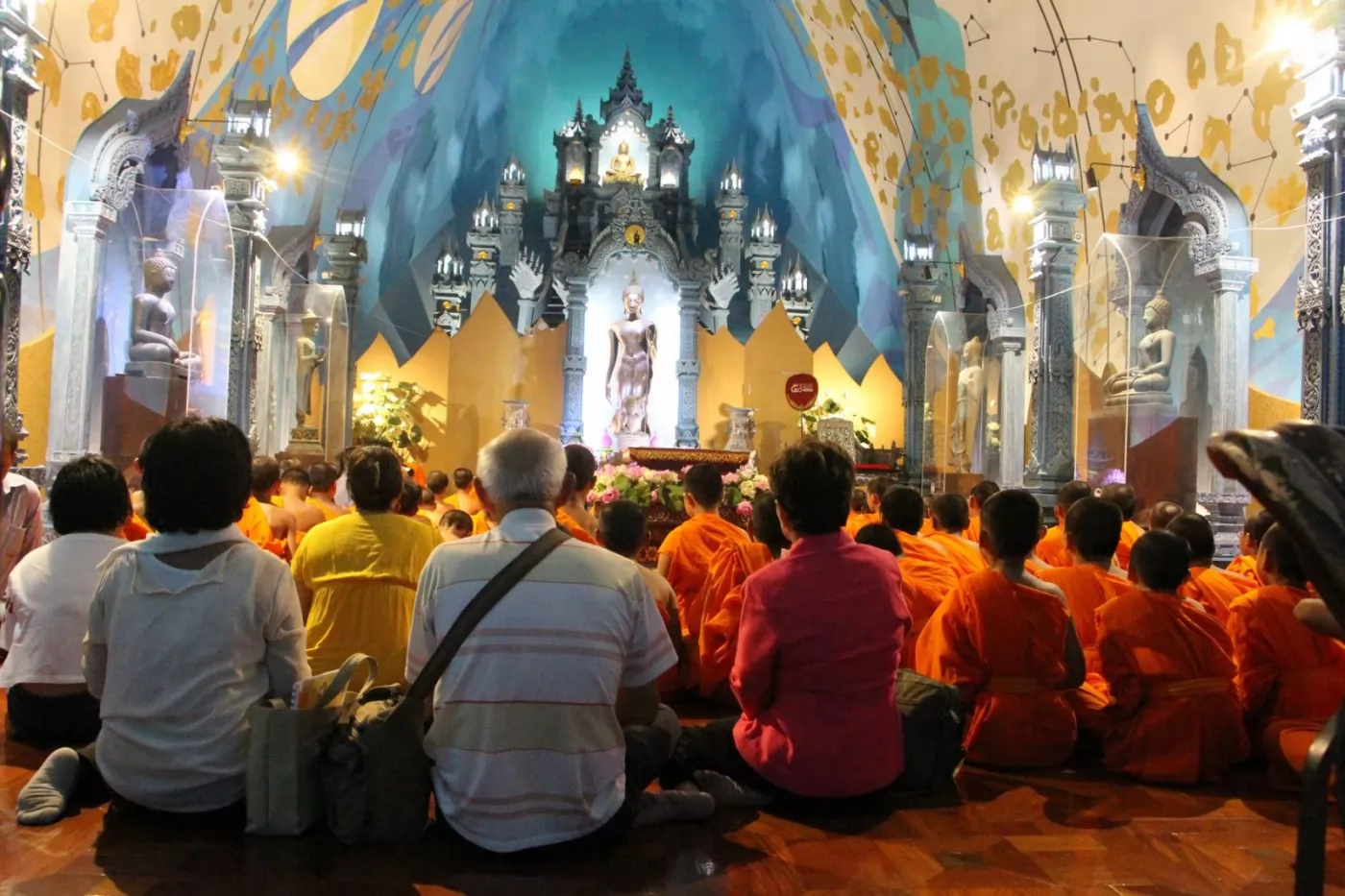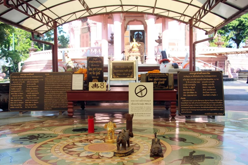 可乘象腿中的電梯通往象腹的博物館,探尋泰國象神文化的奧秘,也可爬旋轉樓梯到象神頭頂的光明神殿,兩旁寶藍色牆面前立著8尊從泰國各地(大城、華富里、拉塔納柯幸)網羅到不同朝代(大城、蘭納王朝)、不同質地製作的佛像。泰國民眾喜歡向著中央的立佛虔誠敬拜,捐錢做公德;伴隨著梵樂,前來參拜的佛徒坐在地板上膜拜、靜思(有冷氣);也能從象眼俯瞰園區景致。