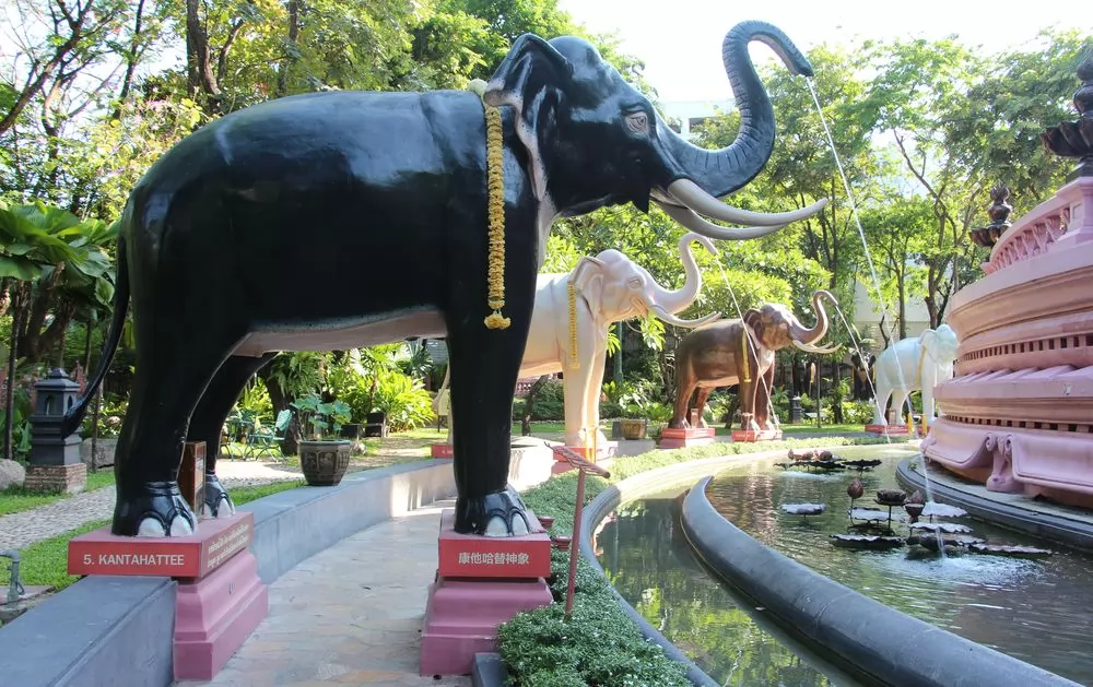 主建築外圍增設許多景觀,像是多尊大象圍繞的大象步道,每尊象身都有自己的名字和不同顏色,當你從大象身下穿過時,它會發出叫聲為你祈禱。水池則是讓信眾購貢品,施放蓮花帶走霉運。