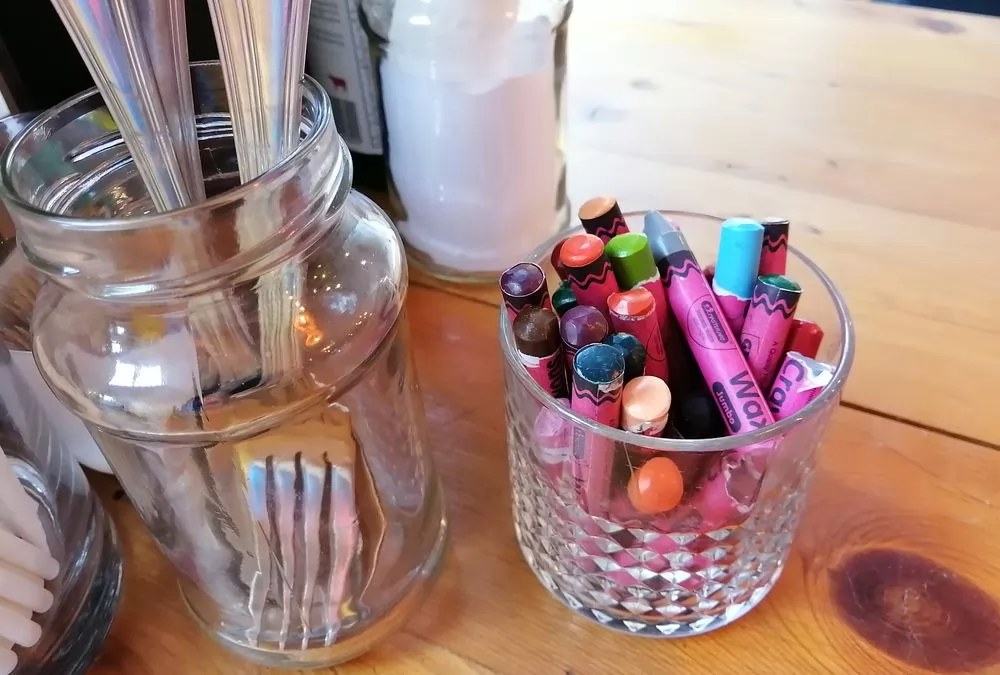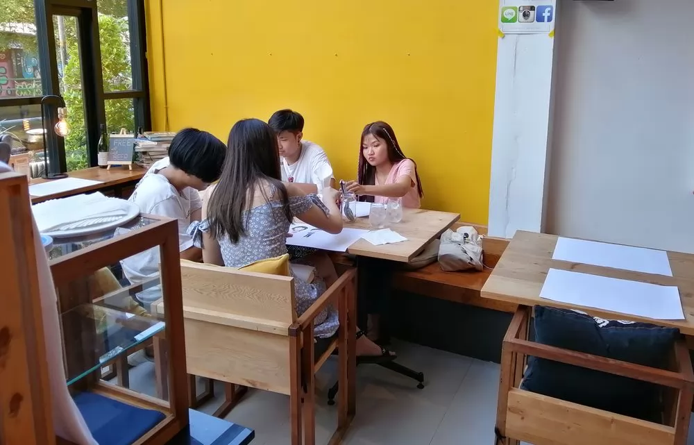 這家店很有意思,桌上的餐紙就是一張白紙,旁邊有蠟筆讓你順便塗鴉,年輕的學生在店前拍照打卡,也不忘了進來吃東西,塗鴉作紀念。