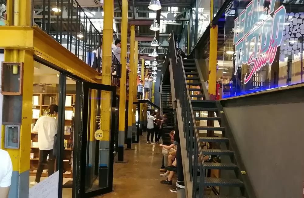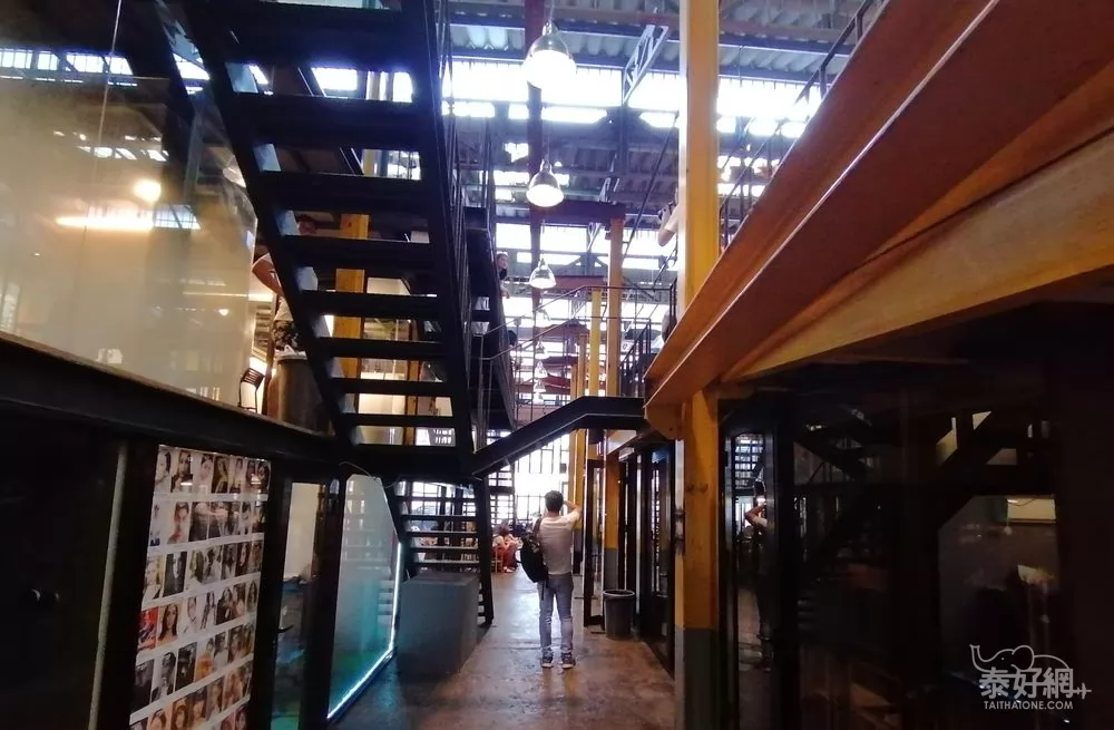 波浪狀的屋頂底下,自然光錯落灑落,鋼架構的線條交錯重疊,上下樓梯或者平行的廊道空間裡隱藏著一間間的工作室、創意店鋪。前門的咖啡館空間比較大,因此這裡經常變身為發佈現場、迷你市集、休閒遊樂區……。