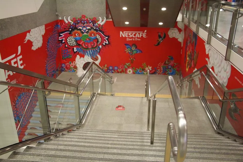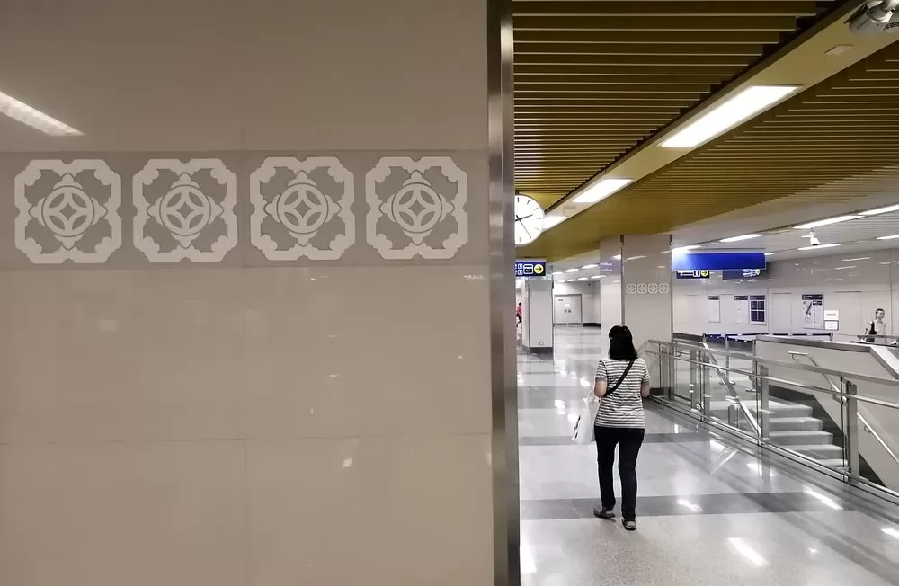 出口(進站)步行階梯,天花板採用了波浪式風格,形似一條蒼龍,而過往的行人也宛如走在蒼龍身下一般,牆上鑲嵌「龍」和「蓮花」的磁磚,為其標誌。