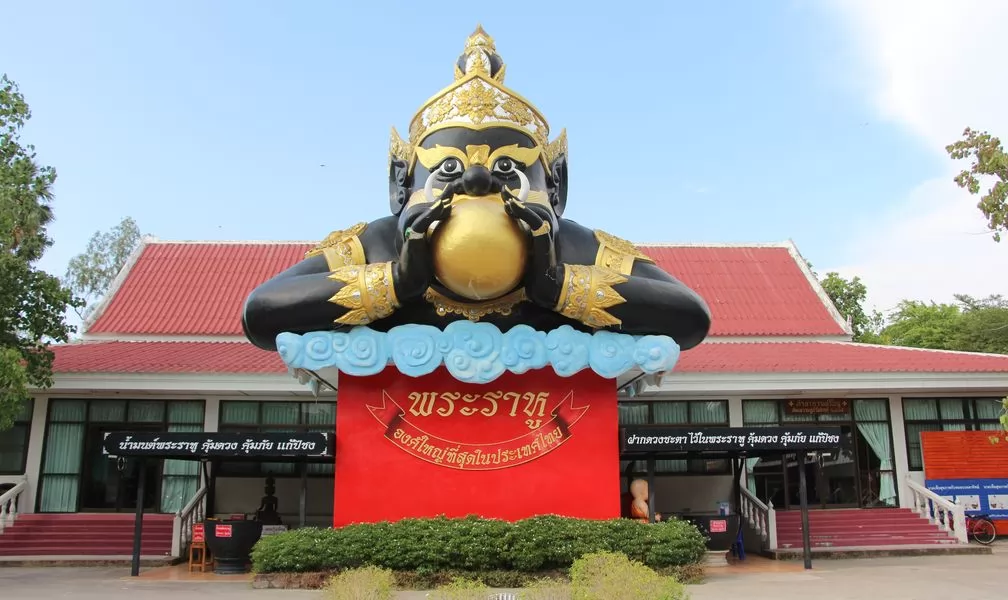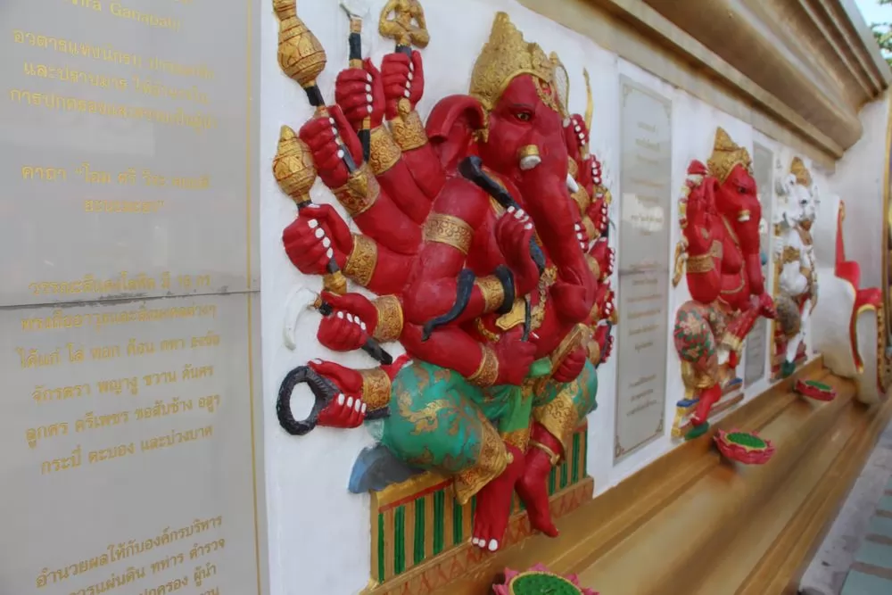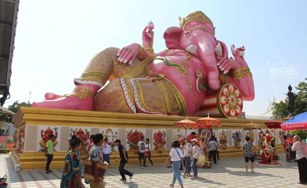 這裡供奉的巨大象神,高16公尺、寬22公尺,在2010年修建完工,號稱泰國、甚至世界最大側臥姿態的象神,粉紅的色澤漂亮,加身上相當華麗的飾品,更加鮮豔且飽滿。泰國參拜的信眾也把粉紅色當作幸運色。象神的4隻手當中,一隻持著蓮花,另一隻則拿著斷掉的象牙,另外兩支擺出休閒優雅的動作。