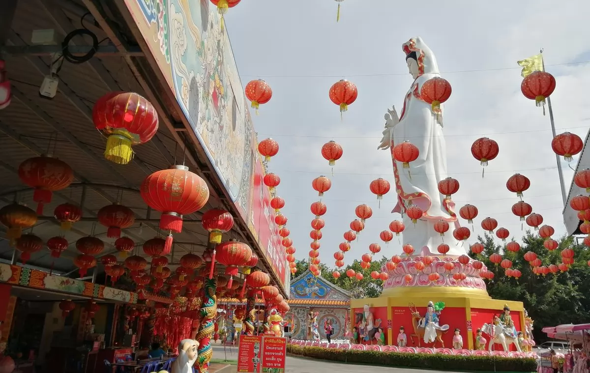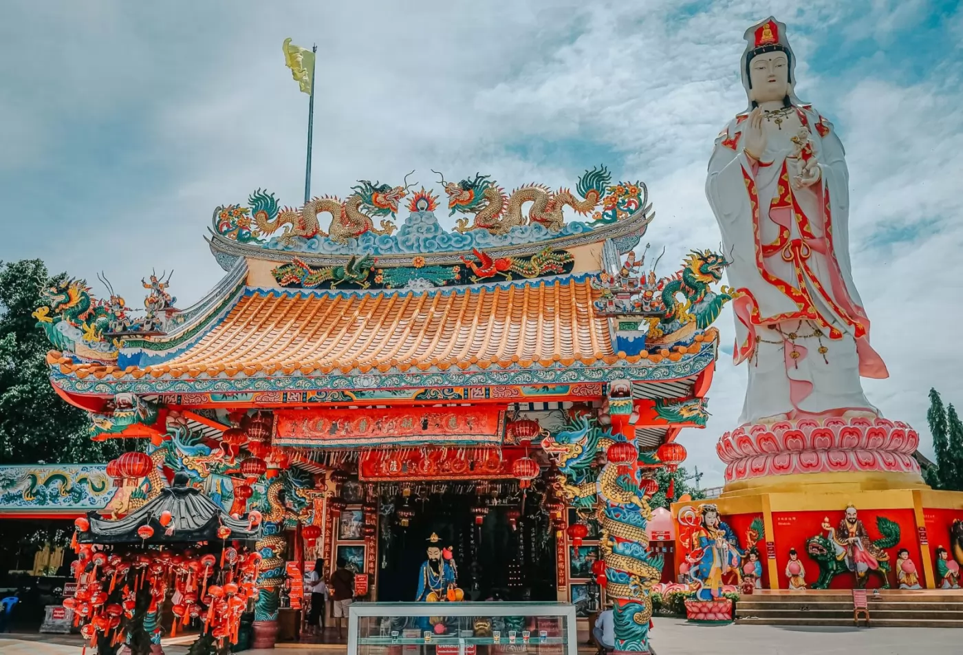 這座寺廟,據傳在一百多年,當地一位極富裕的華人離世後,其妻為紀念他而建立,這兒也可見許多中國佛教的傳統神像,藍天白雲下,偌大的觀世音菩薩神像肅穆莊嚴地矗立在河岸邊,看起來特別有股神奇的力量,基座為八仙過海雕像。