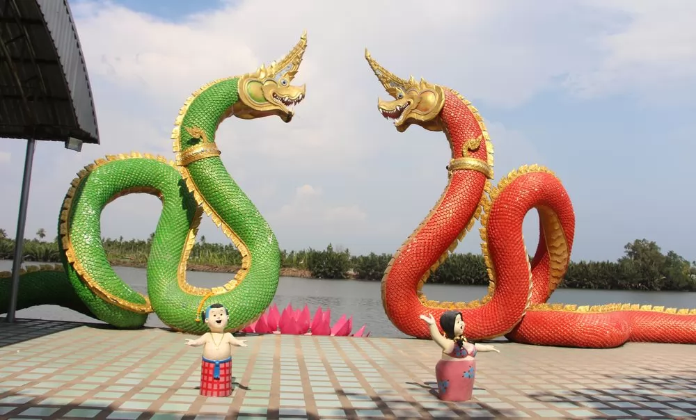 環繞河畔的巨龍龍王迦納(Naga),一紅一綠非常絕配亮眼,場景營造的相當壯觀優美,迦納素有泉水、井水跟河流的保護神之稱。