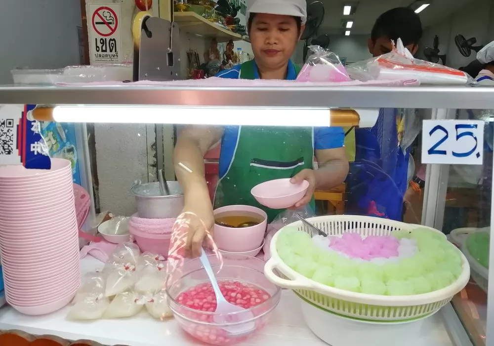 原先是以甜點起家,現在還保留1種手工甜品:紅寶石榴椰奶冰,散發一股燻香的味道,相當有泰國特色,1碗25銖,很消暑。