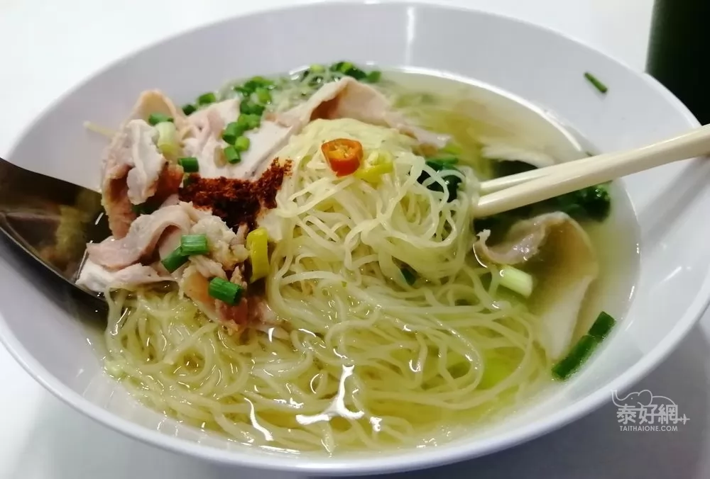 他們家手工自製的細麵,麵粉少雞蛋多,很Q彈,清湯鮮!加上叉燒肉片、蔥花,簡單的美味,普通1碗35銖;特級1碗45銖。