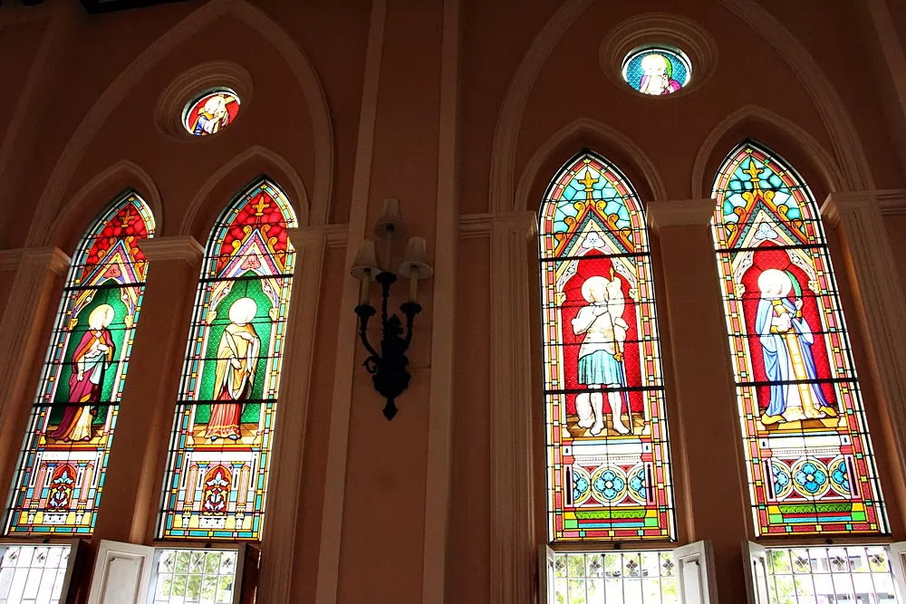 步入教堂,外觀與內部裝飾都是非常精美,有典型的哥德式鐘樓,四座「告解室」,古老莊嚴肅穆的講壇,牆體裝飾精美,水晶吊燈耀目,配有彩色玻璃窗,繪有各種神像,木質天花板,百年歷史的瓷磚地板,兩排棕粉色的柱子支撐着巨大的穹頂,整齊擺放的木質座椅供信徒來此作禮拜。