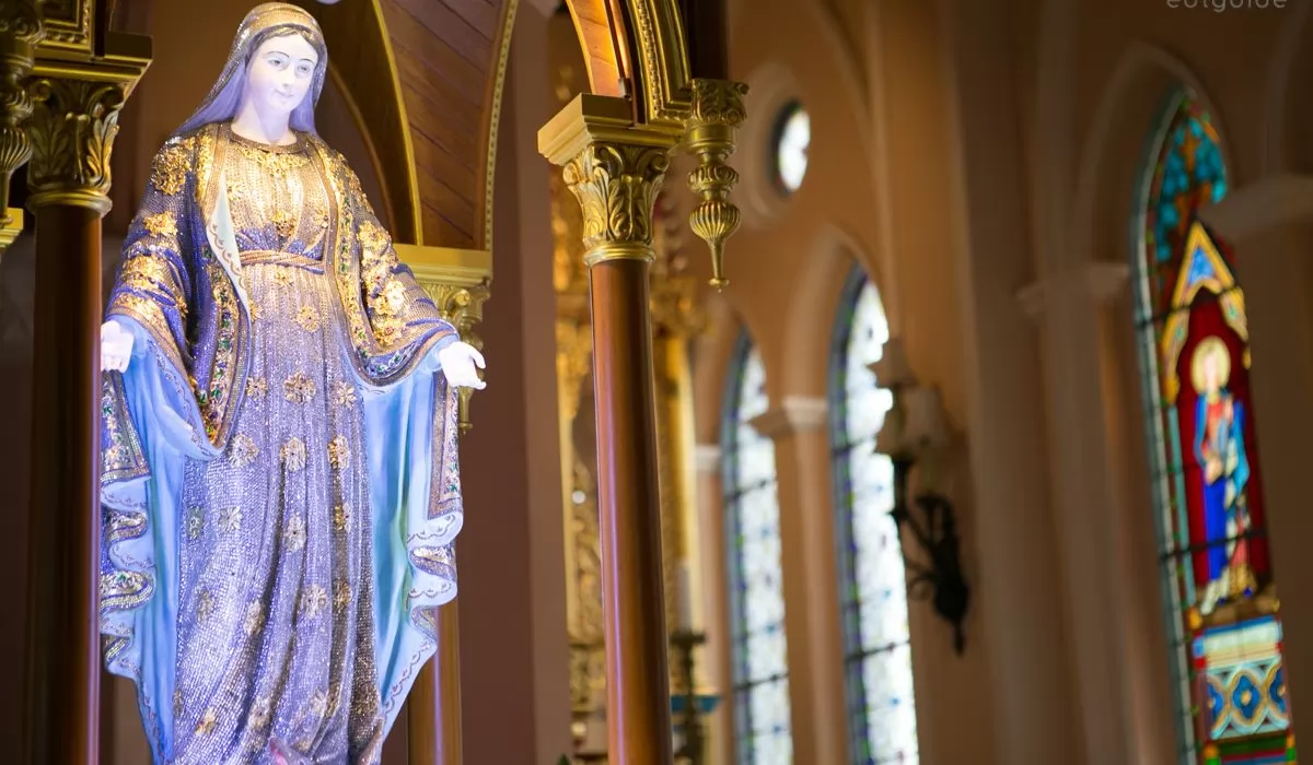 在燈光照射下,聖母瑪利亞的雕像光彩奪目,熠熠生輝,引人注目。