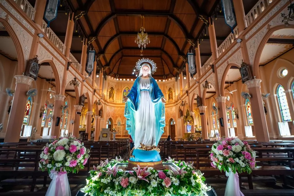 教堂內的一尊腳踩巨蛇的聖母雕像,由虔誠的Chanthaburi天主教徒捐贈,裝飾極盡奢華,身上幾乎完全覆蓋着黃金、寶石和瓷釉,她斗篷的藍色是由幾萬顆來自北碧府的藍寶石所鑲上的,而禮服是由數百顆來自斯里蘭卡的白色藍寶石,還有畫龍點睛的紅寶石,據說在20萬至50萬顆之多,總重2萬克拉。