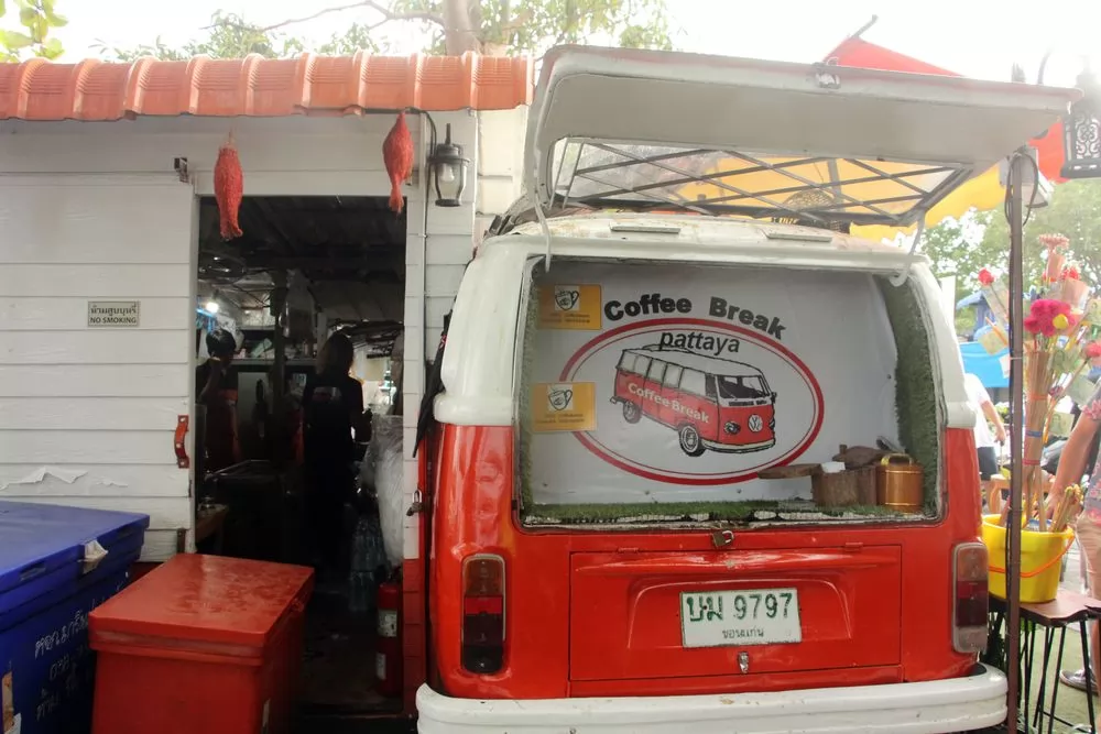 這裡有個喝咖啡的小攤位,Coffee Break,沒有什麼招牌,就是個快餐車,冰甜點、果汁、冰咖啡等都是在一輛橘色的麵包車上製作,這也是最大亮點。