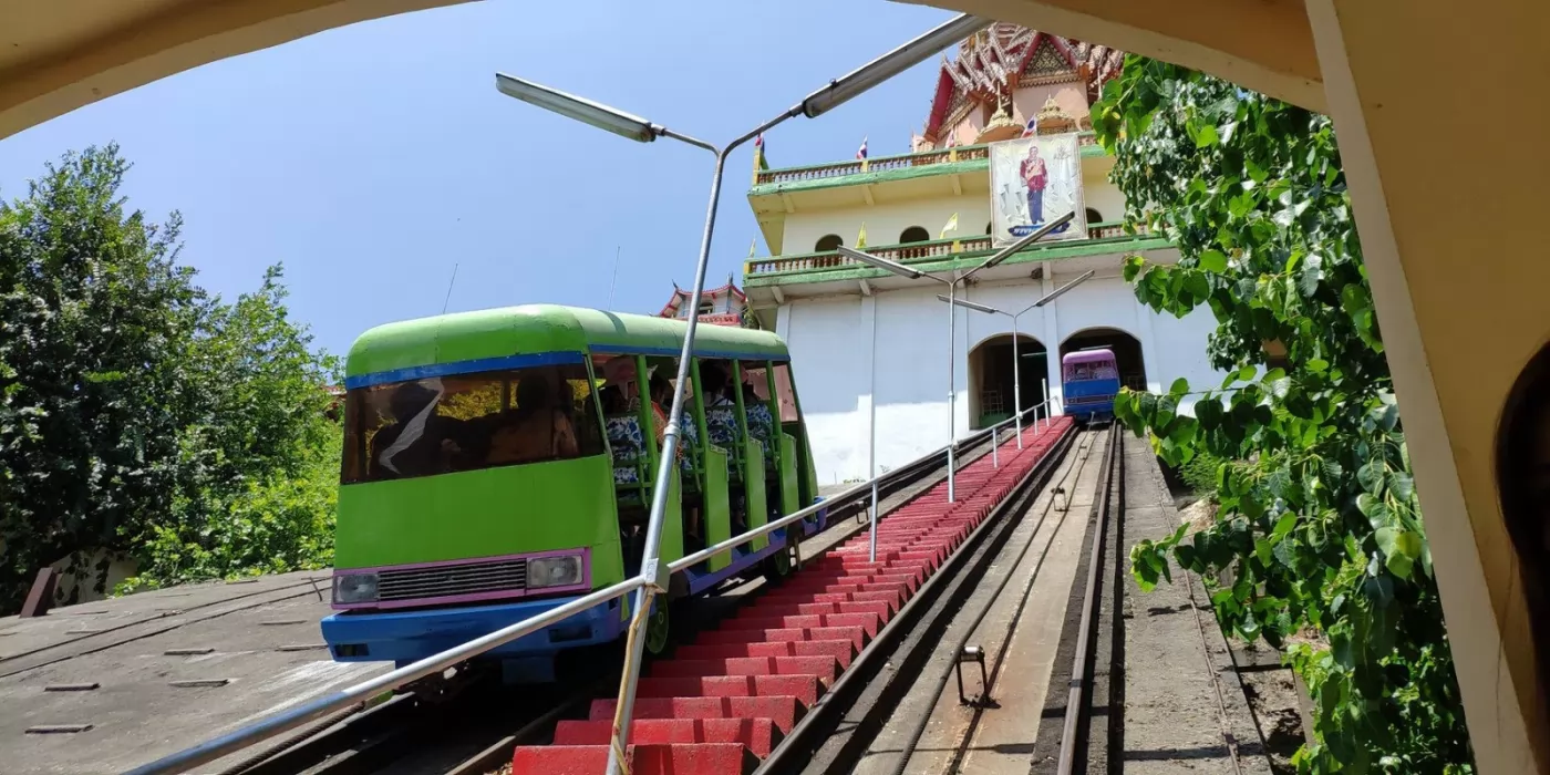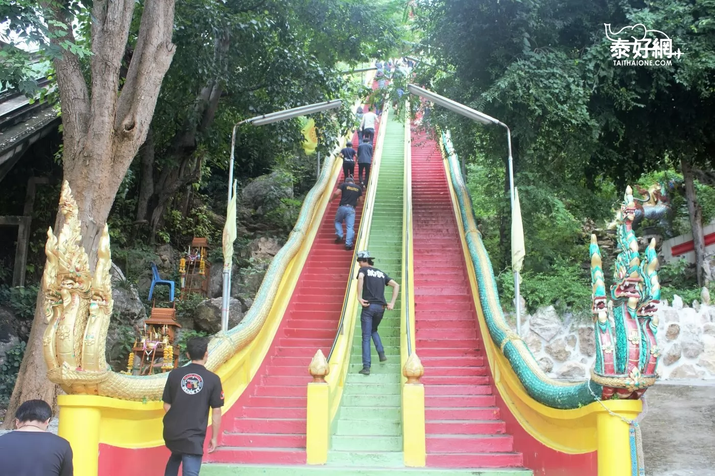 寺廟入口處位於山腰,想要到達山頂,可以選擇攀登157級陡峭樓梯而上(左右兩側上下,中間有扶手的走道),也可以搭45度角直上直下的接駁纜車,每人20泰銖,注意上去後票先留著,因為這是來回的票價。