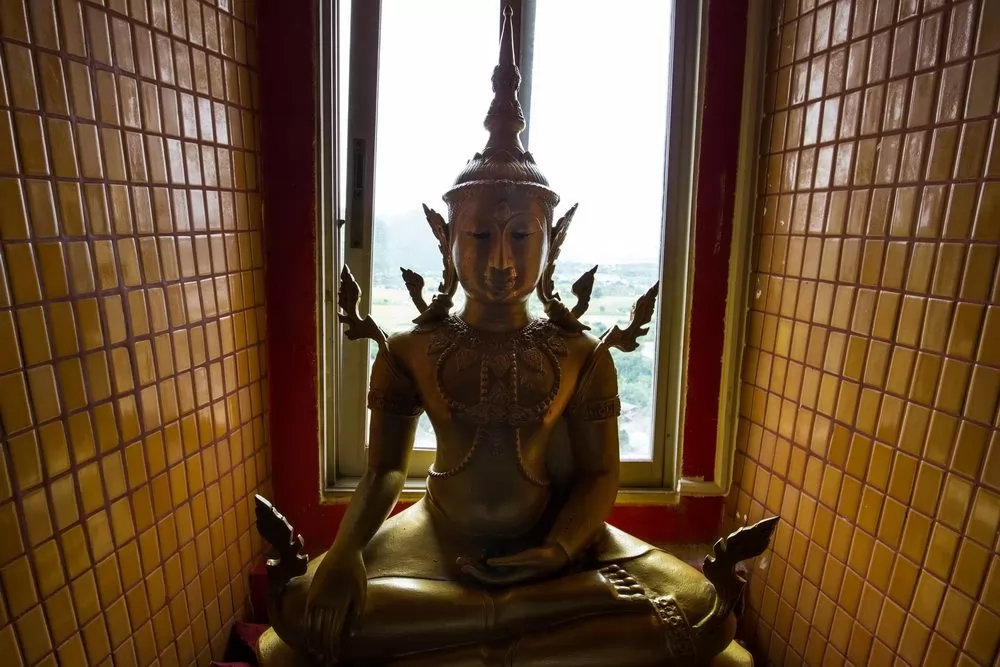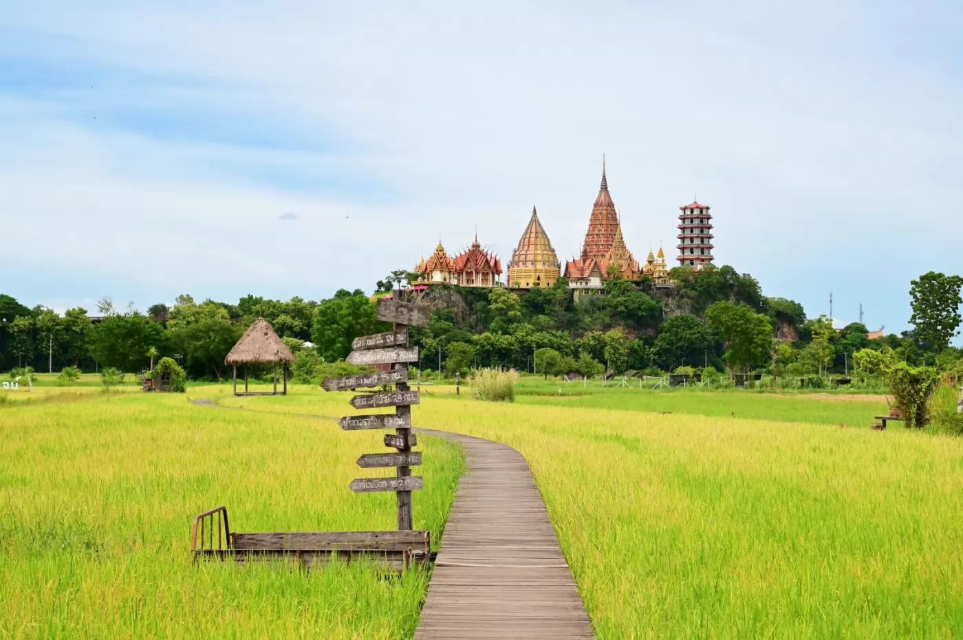 虎穴寺(Wat Tham Sua;วัดถ้ำเสือ)是北碧府最出名、香火最鼎盛的寺廟,18米大金佛的壯觀和在中、印佛塔眺望美景,山腳下綠油油稻田裡的咖啡店,更是網紅打卡熱點,值得來此一日遊!