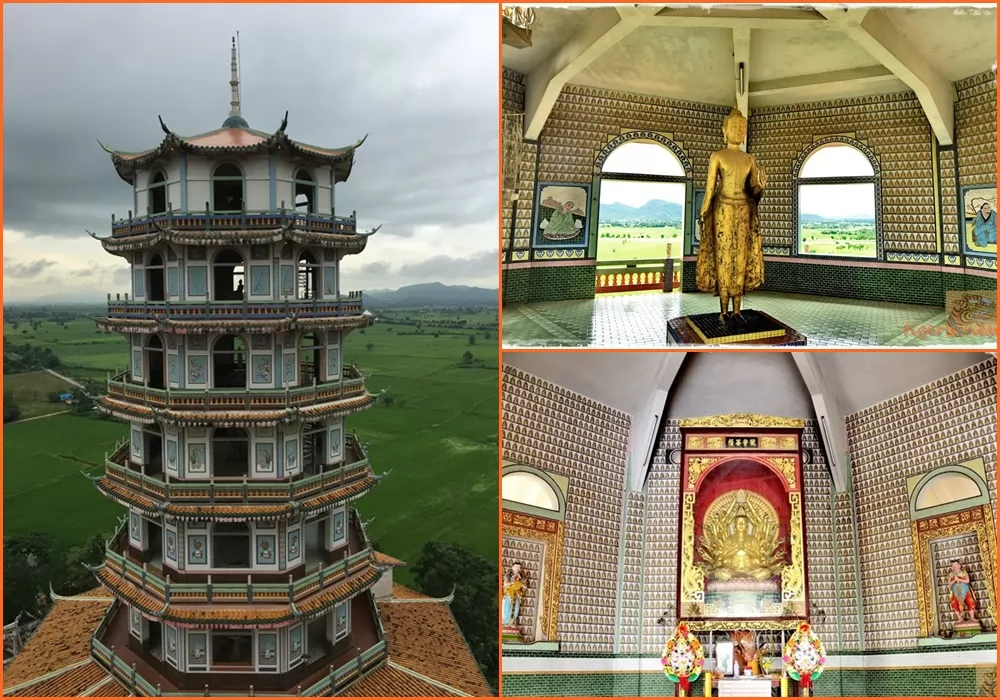 九層高的印度風格佛塔,高69米、寬29米,可以走路或者乘電梯而上,每一層都有不同主題的佛像和多個窗口看外景,爬到佛塔頂端,周圍的田野風光一覽無遺,前方桂河水霸及群集的房舍,後方是綠油油的稻田,和諧、美麗。
