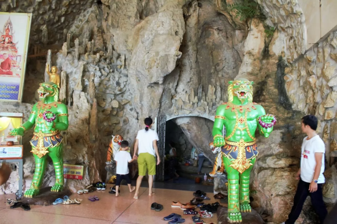 Wat Tham Sua以字義來解釋,就是有「老虎洞穴的寺廟」,與喀比的虎穴寺同名。相傳以前有苦行僧來此修行,得到老虎保護,然後修建寺廟,這裡有個老虎盤據過的山洞,虎穴寺名稱由此而來,洞口有兩尊虎頭人身的守護獸,可以脫鞋入內參觀,有燈光照明,裡面放置幾尊大小不一的佛像。