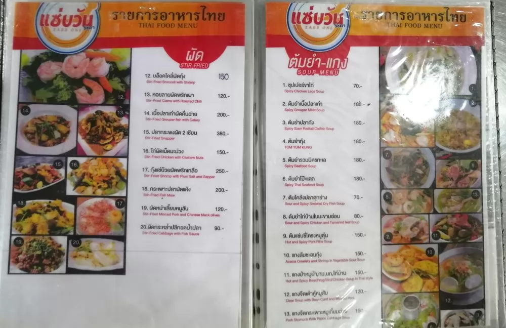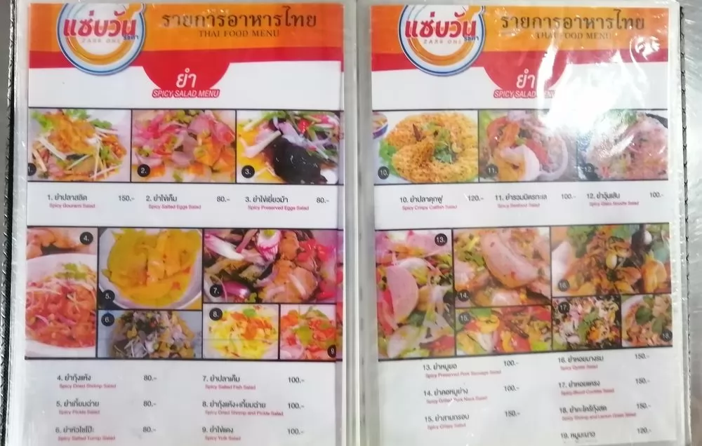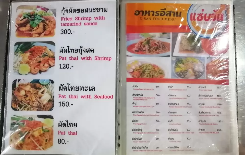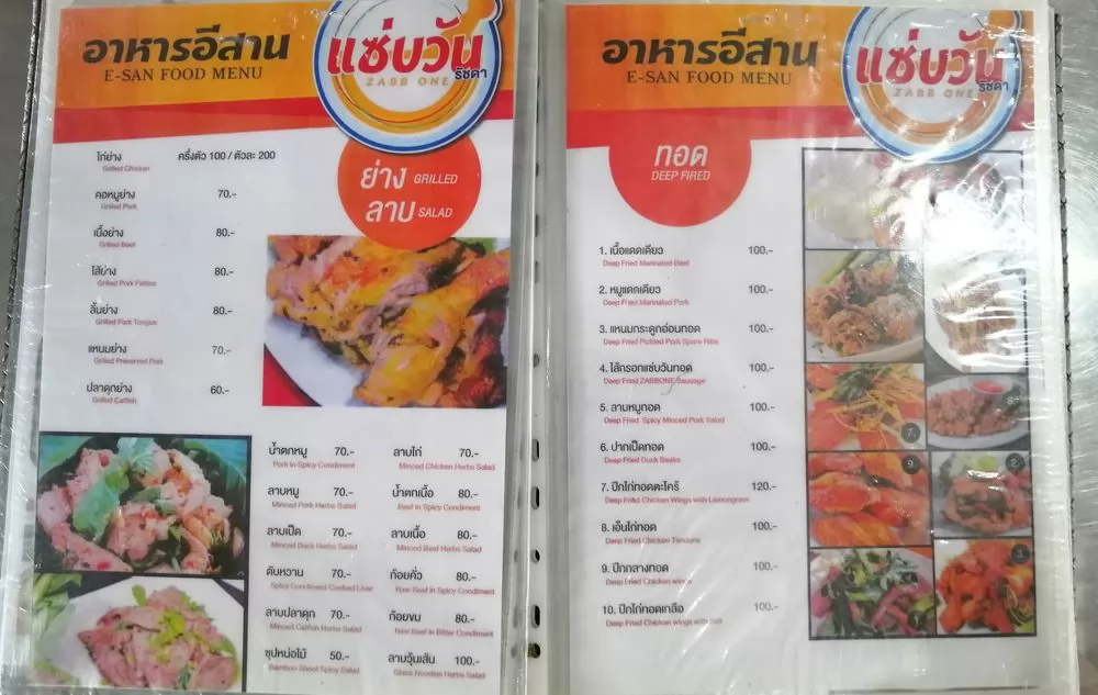 店內有英文Menu,最多人點的有青木瓜沙拉、烤雞、燒豬頸肉、烤魚、烤豬腸、東北酸湯等,價錢便宜,大部份菜式都是60-150,東北火鍋也只是250銖。