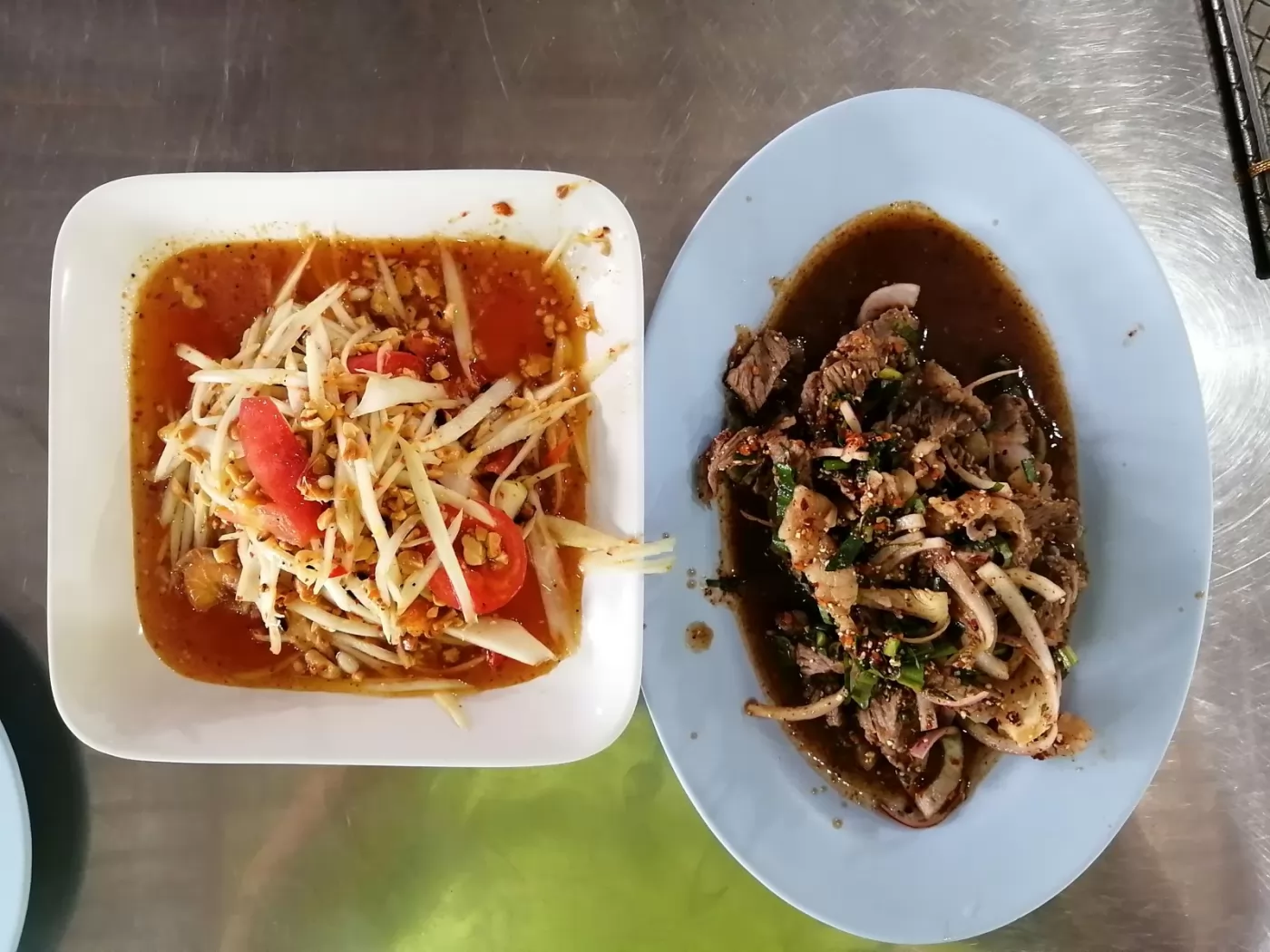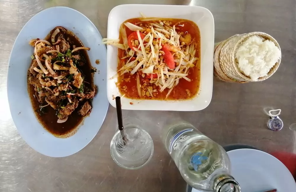 象哥點了泰式宋丹、涼拌豬肉,加上1盒糯米飯和1瓶水,200銖有找。